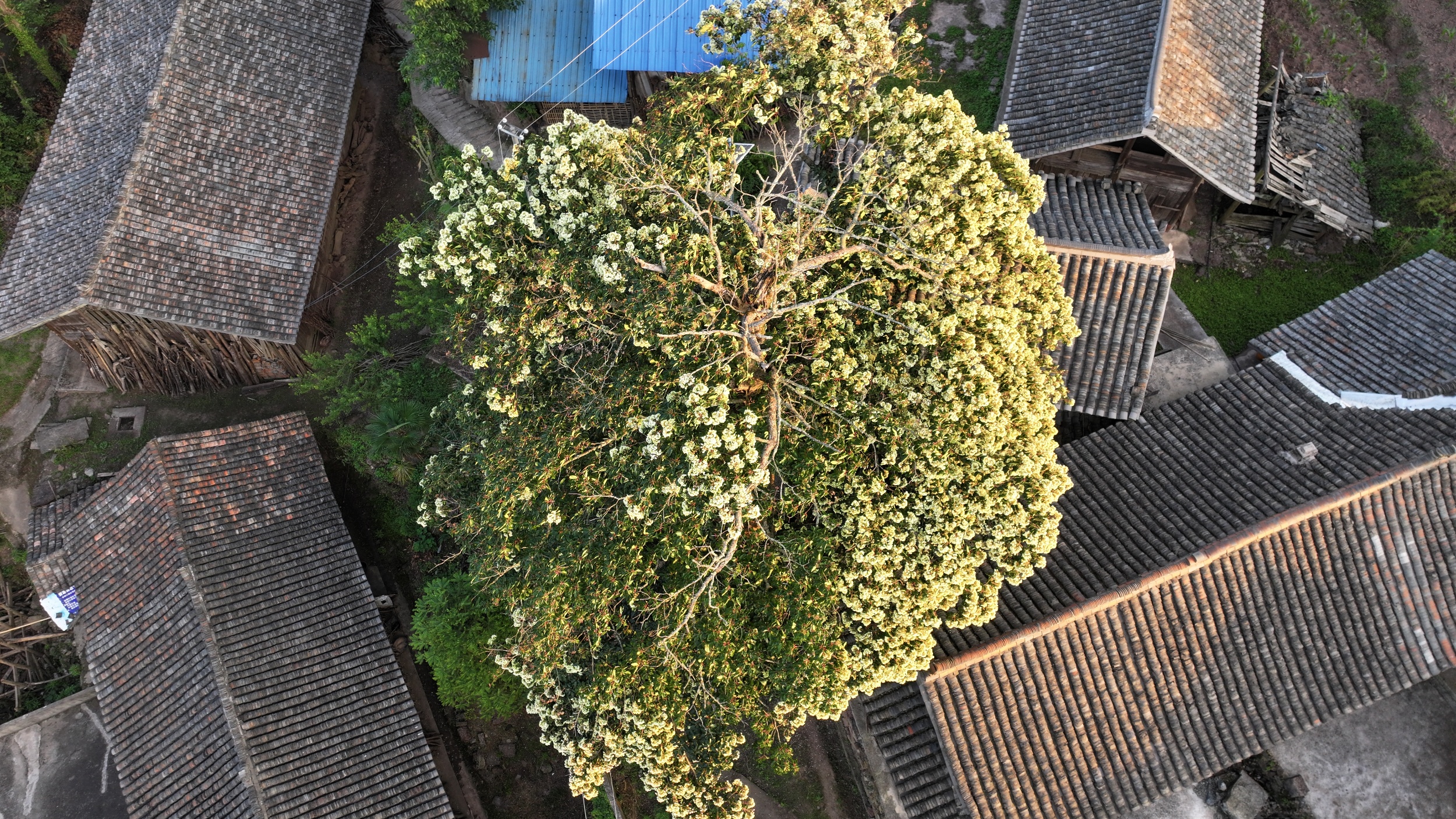 A thousand-year-old Emmenopterys henryi is seen in bloom in Shiqian County, southwest China's Guizhou Province, in this photo taken on July 20, 2025. /Photo provided to CGTN