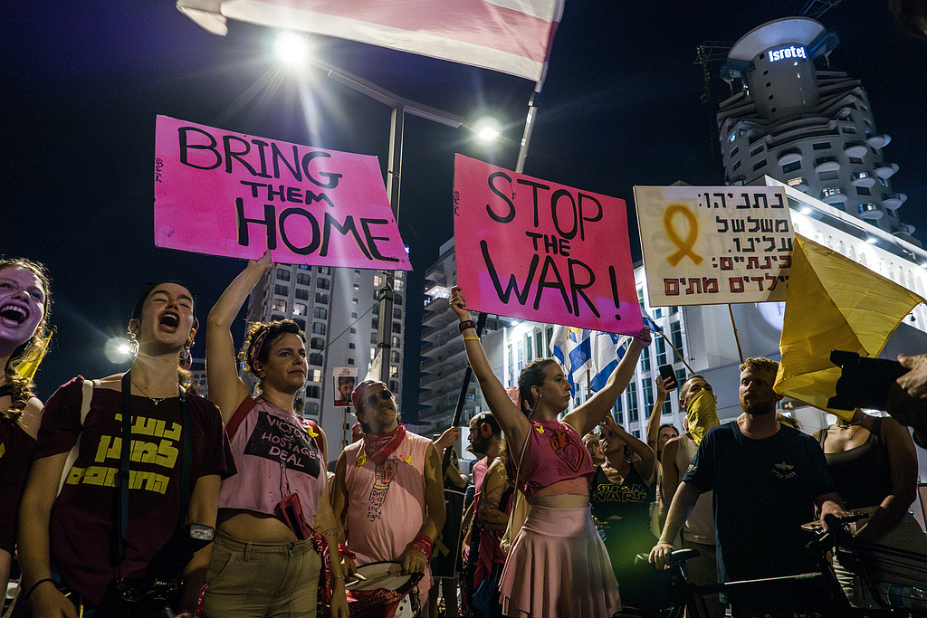 Hundreds of people gather in front of the U.S. Embassy building to stage a protest demanding a ceasefire in Gaza and the return of Israeli hostages, Tel Aviv, Israel, July 26, 2025. /VCG