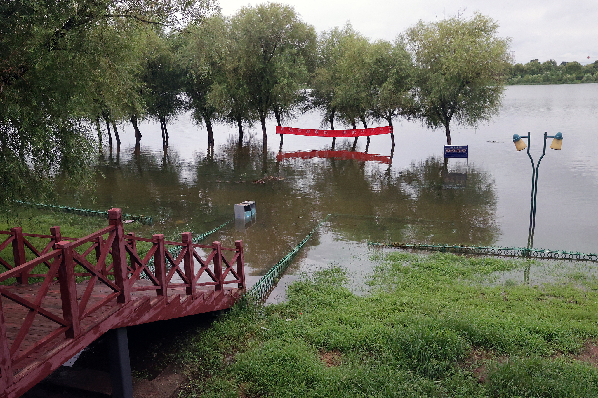 Public facilities are flooded by the rising Chaobai River, Beijing, China, July 28, 2025. /VCG