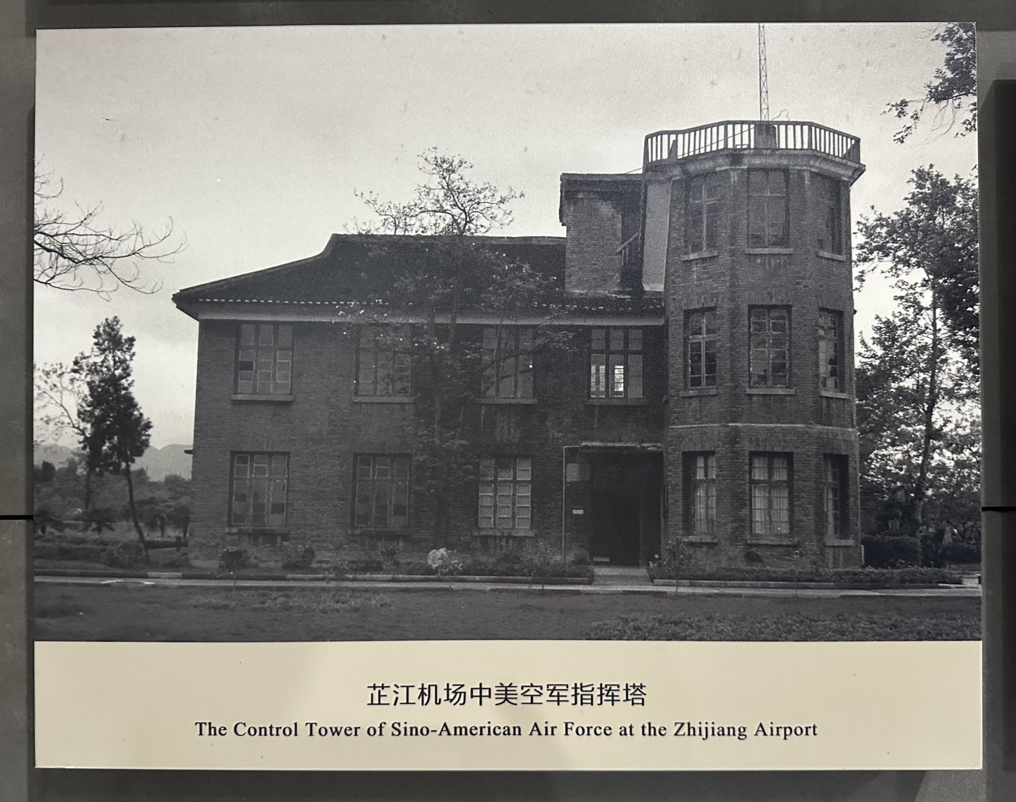 A historical photo of the control tower of the Sino-American Air Force at Zhijiang Airport, originally taken years ago, seen here in a photograph taken on July 25, 2025, is preserved in the museum. /CGTN