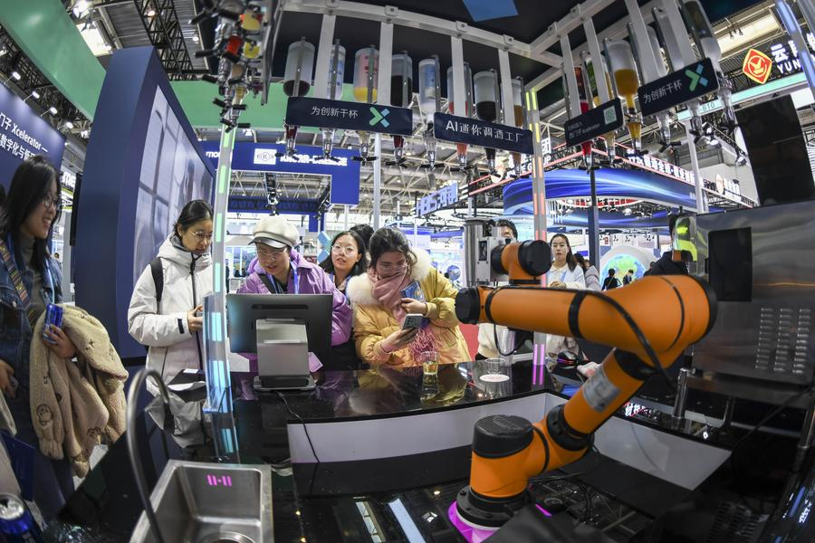 An artificial intelligence-driven bartending system at the Siemens booth in the Advanced Manufacturing Chain exhibition area of the second China International Supply Chain Expo in Beijing, China, November 27, 2024. /Xinhua