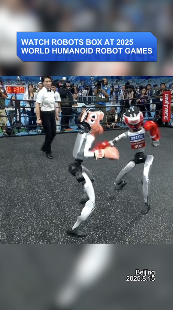 Two humanoid robots clash in the ring at Beijing's World Humanoid Robot Games.
