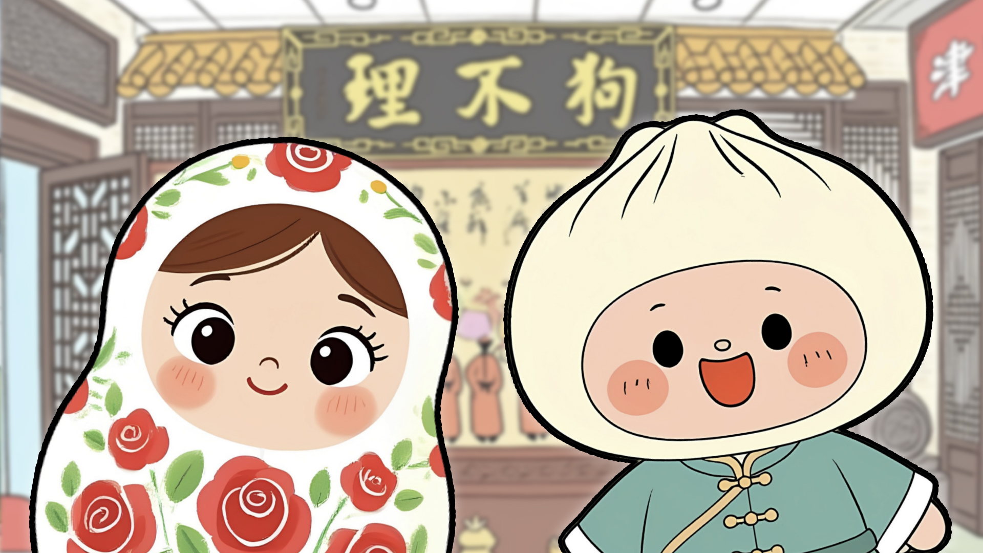 After accompanying her owner on a trip to Tianjin, a Russian matryoshka nesting doll ends up on the city's most famous snack street. At the legendary Goubuli steamed bun shop – whose name is often (mis)understood as "the buns that even dogs ignore" – a playful question arises: Do dogs really turn their noses up at these buns? Or are these buns, with their thin skin, juicy fillings, and eighteen folds, as elegant as flowers in bloom?