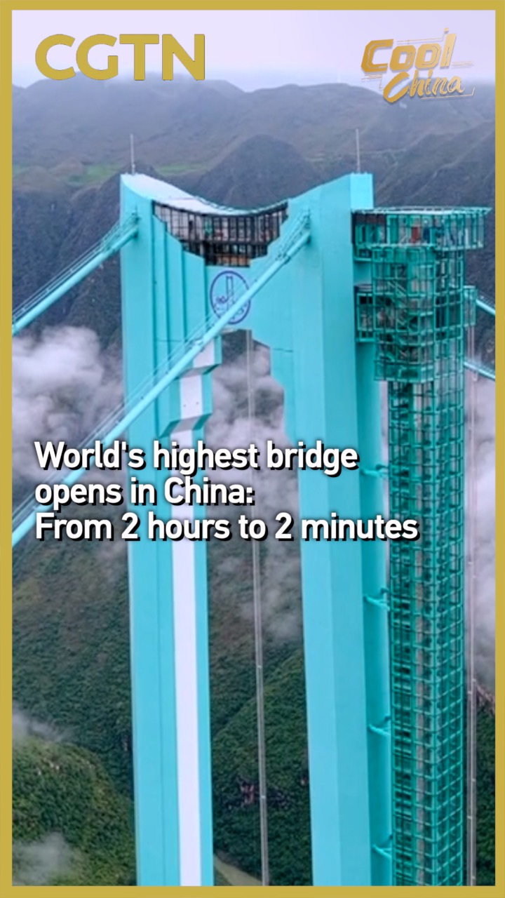 The Huajiang Canyon Bridge in southwest China's Guizhou Province, now the world's tallest and longest-spanning canyon bridge, officially opened to traffic on Sunday. With a 625-meter vertical drop and a 1,420-meter main span, the megastructure cuts travel time across the canyon from two hours to just two minutes.