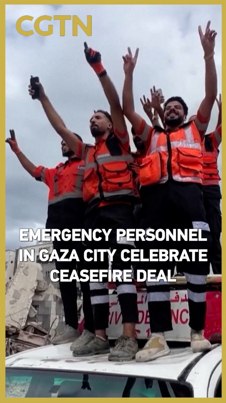 Emergency personnel in Gaza City sounded sirens and cheered on October 9 after a ceasefire and hostage deal was announced to end the war in Gaza.