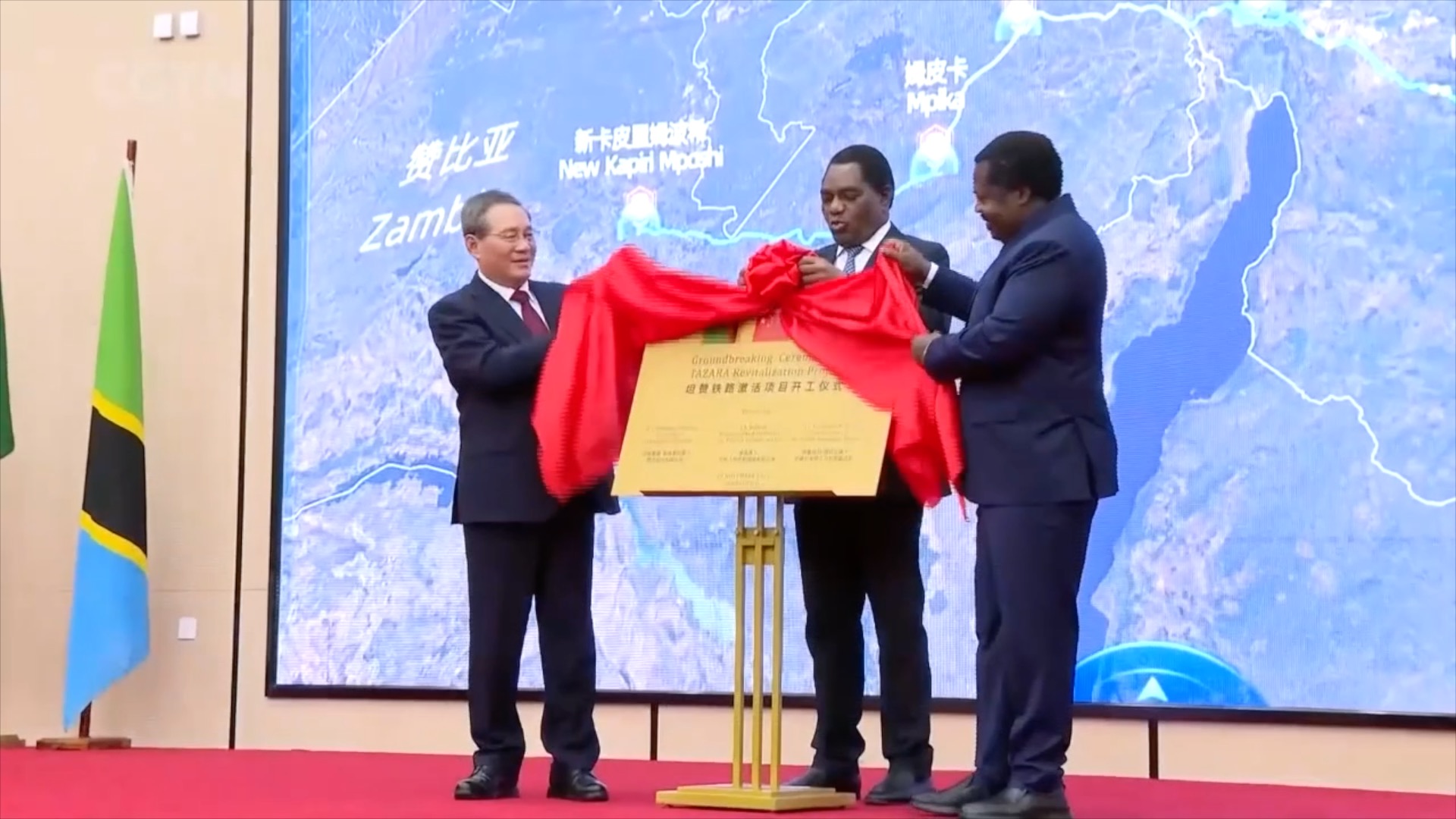 Premier Li Qiang said China is willing to work with Zambia and Tanzania to advance the development of a prosperity belt along the Tanzania-Zambia Railway and foster a new hub of economic growth. He made the remarks on Thursday at the groundbreaking ceremony in Lusaka of the Tanzania-Zambia Railway revitalization project. Zambian President Hakainde Hichilema and Tanzanian Vice President Emmanuel Nchimbi were present.