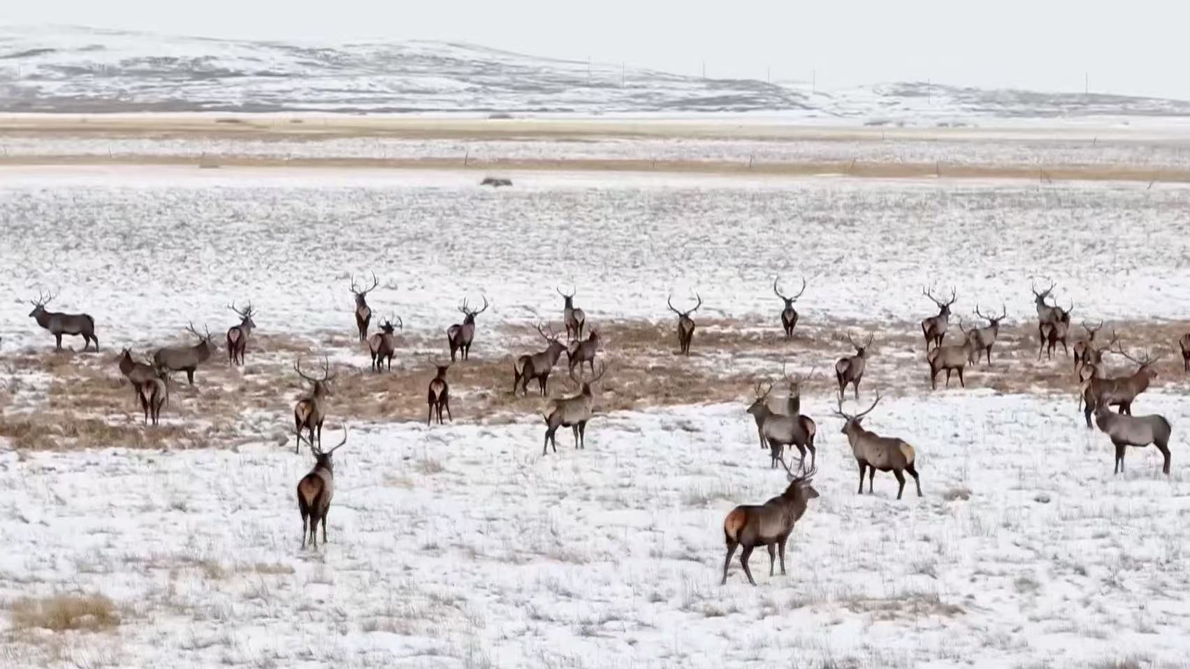 A herd of some 100 wild red deer, a nationally protected species, have been spotted in Baiyinxile, a part of the Xilingol National Grassland Nature Reserve in north China's Inner Mongolia Autonomous Region. Aerial footage shows the animals roaming freely, foraging and resting, bringing vivid signs of life to the winter landscape. The Baiyinxile Pasture spans over 3,400 square kilometers and forms the core of the reserve. Thanks to sustained conservation efforts in recent years, the local ecosystem has steadily recovered, providing a safe, stable habitat for red deer and other wildlife to thrive.