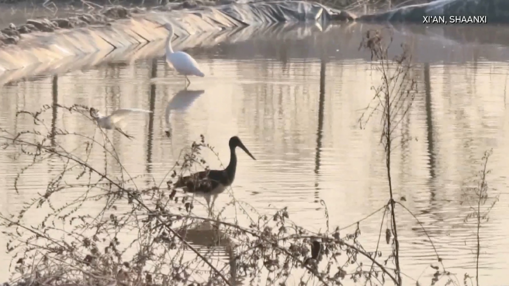 Nearly 50 black storks have been seen wintering in farmland in NW China's Xi'an, marking their largest return yet. First seen here in 2019, the state-protected birds have returned year after year, drawn by improved habitats and eco-friendly rice-fish farming practices.
