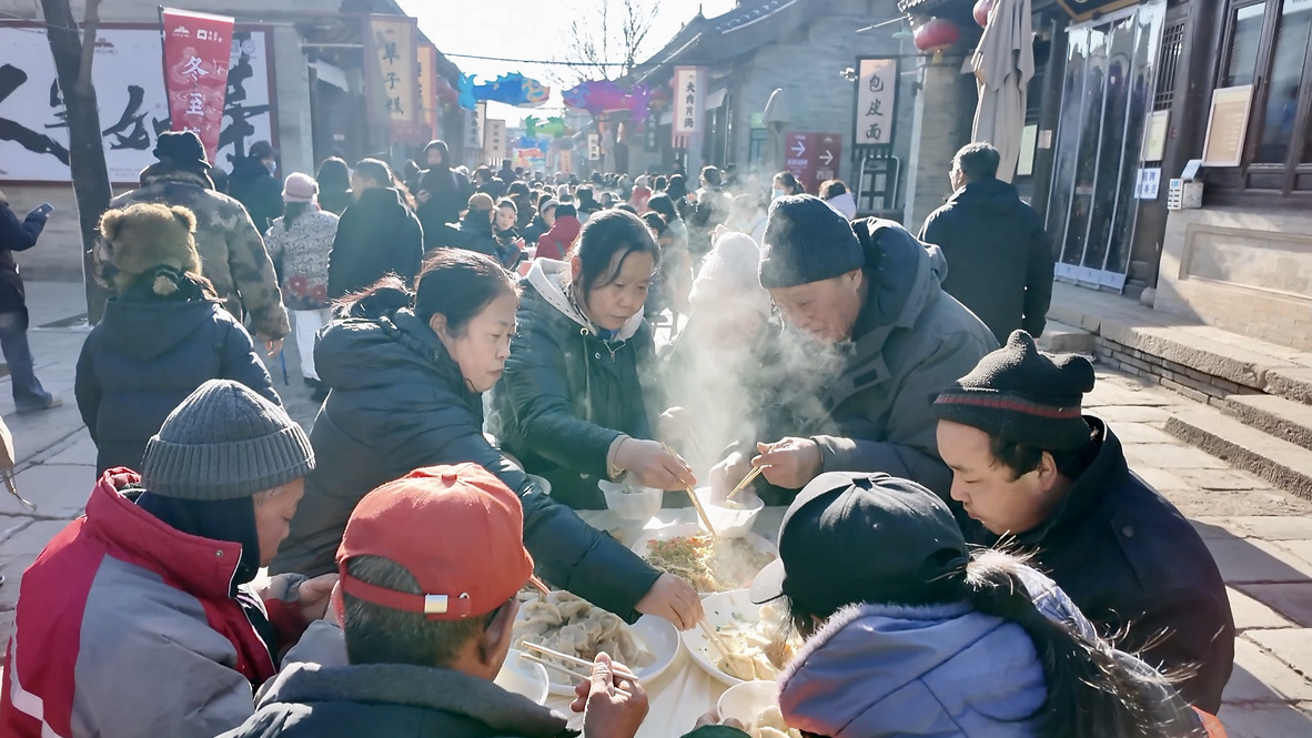 December 21 marks the Winter Solstice, a traditional Chinese solar term marked by the custom of eating dumplings. In Xinzhou Ancient city, Shanxi Province, long queues formed as residents and visitors gathered for a festive long-table dumpling feast. Wooden tables stretched along the ancient street, drawing people together to share free dumplings and local delicacies in a warm and communal atmosphere.