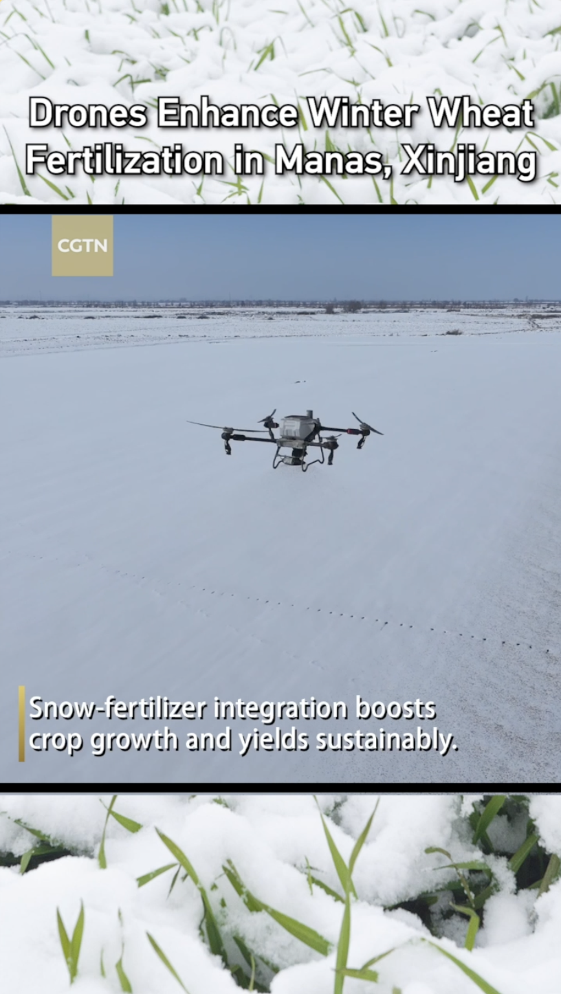 Farmers in Manas County, Xinjiang, are utilizing drones to efficiently fertilize winter wheat during its critical regrowth stage. Compared with traditional methods, drones cut costs by over 10 yuan (around $1.4) per mu, with operations completing 100 mu in just one hour.