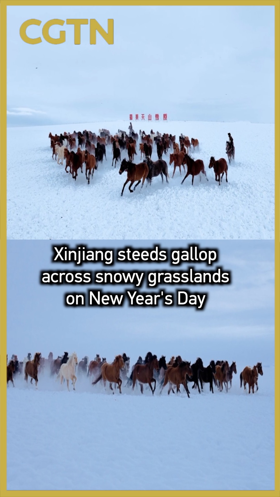 In northwest China's Xinjiang Uygur Autonomous Region, steeds gallop across snowy grasslands in a New Year's celebration.