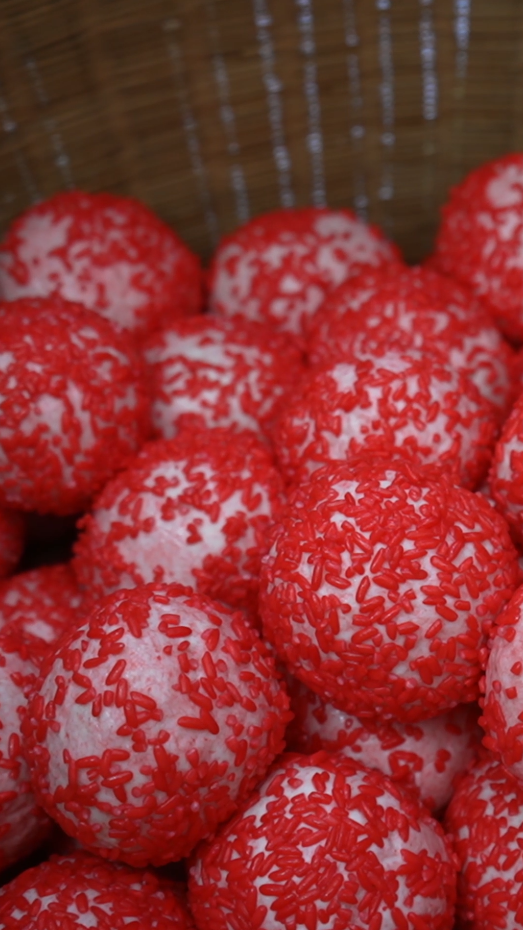 As a traditional food in Tongren, red rice cakes take glutinous rice as the main ingredient and non-glutinous rice as secondary ingredient, and are made through multiple steps including grinding the rice, preparing a starch paste, kneading the dough, rolling it in red rice, and finally steaming it. During the process, edible red pigment is used to dye the rice, resulting in a finished product with a bright red color, round shape, and soft, glutinous and sweet taste.