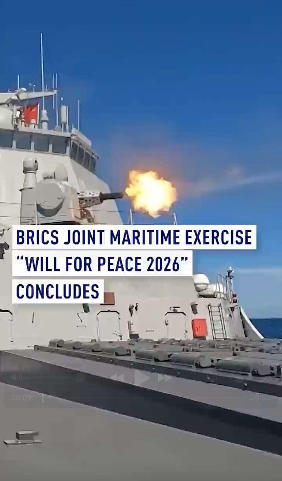 The joint maritime exercise "Will for Peace 2026", involving BRICS members China, Russia, and South Africa, ended on Friday in the airspace and waters near South Africa. Themed "Joint actions to ensure the safety of key shipping lanes and maritime economic activities," the exercise saw participants conduct counter-terrorism, rescue and anti-sea-strike operations, as well as other activities such as professional exchanges and onboard tours.