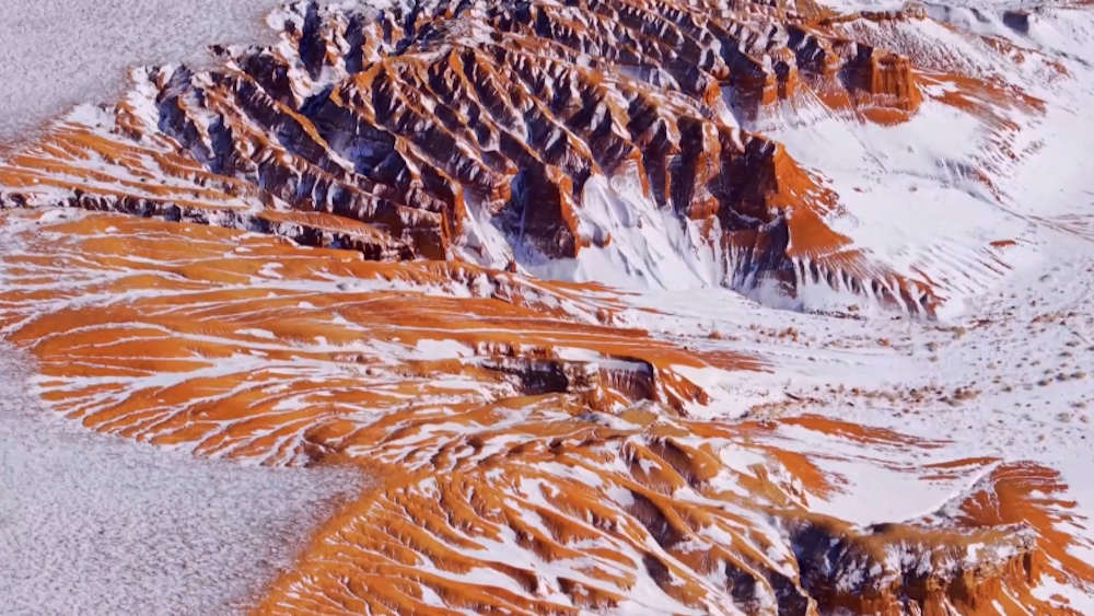 After recent snowfall, Dahong Mountain in north China's Inner Mongolia Autonomous Region revealed a landscape where silvery snow blanketed reddish Danxia landform, creating a dramatic visual contrast. Formed over billions of years by wind and water erosion, the iron-rich rock strata give the mountain its distinctive texture and color. With terrain resembling the surface of Mars, Dahong Mountain is often called a "mysterious Mars-like realm," offering a spectacular fusion of geological wonder and seasonal beauty.