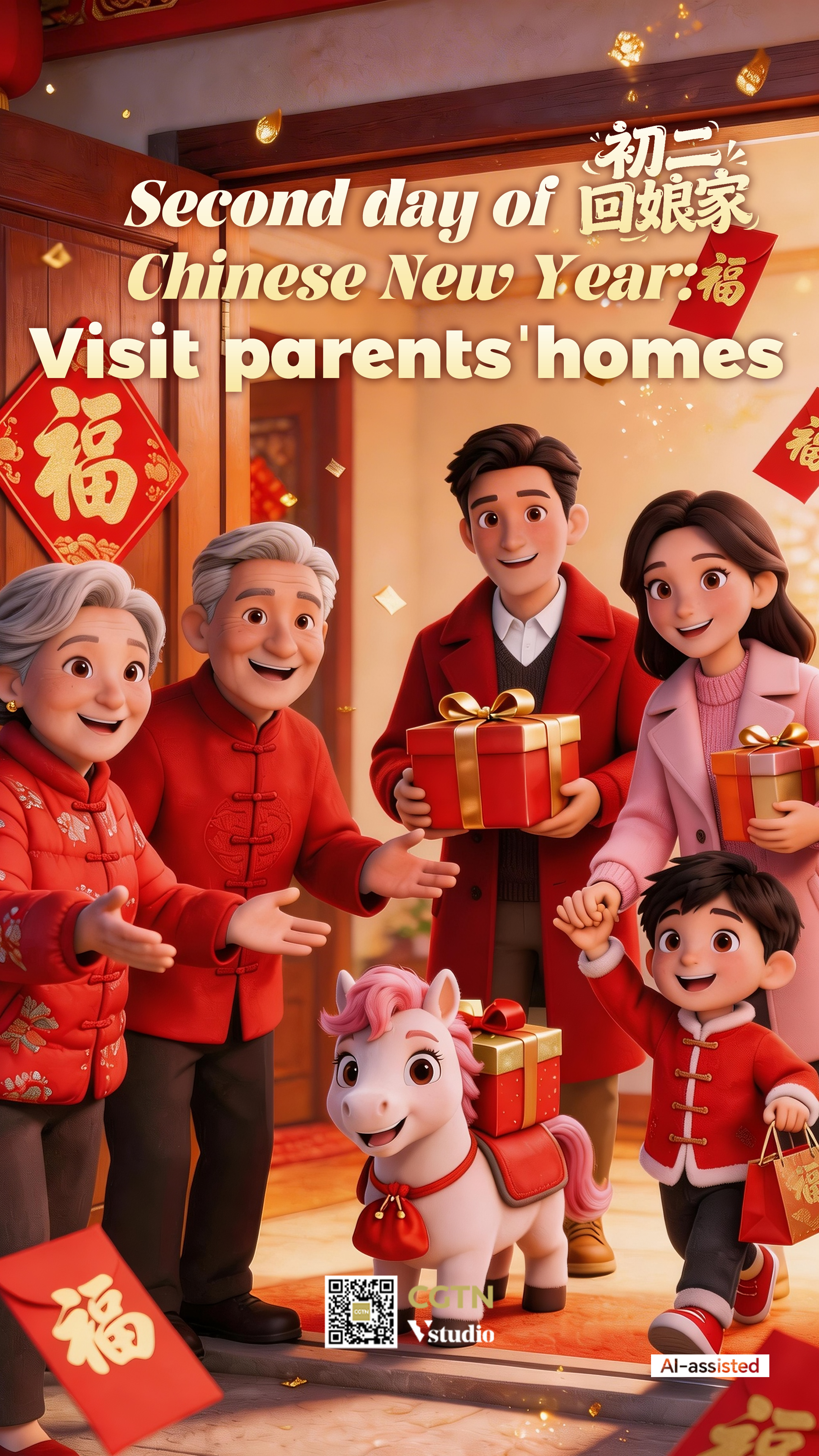 On the second day of Chinese New Year, married daughters visit their parents' homes, bringing and receiving blessings.