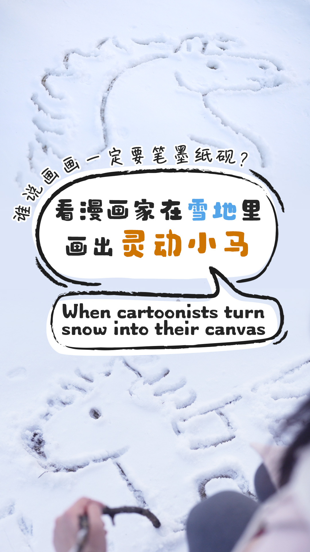 Cartoonists Xu Manxin (Air) and Zhang Chenchen (Toboe) brought creativity to the snow – using branches as brushes and snow as their canvas. With a few playful strokes, they sketched an adorable pony, full of the whimsy and charm only a cartoonist's touch can bring. Simple, innocent and utterly delightful. As long as you have imagination and something to draw with, any place can be your studio! Join CGTN's #AllThingsHorses challenge, share your creation and let the blessings gallop your way!