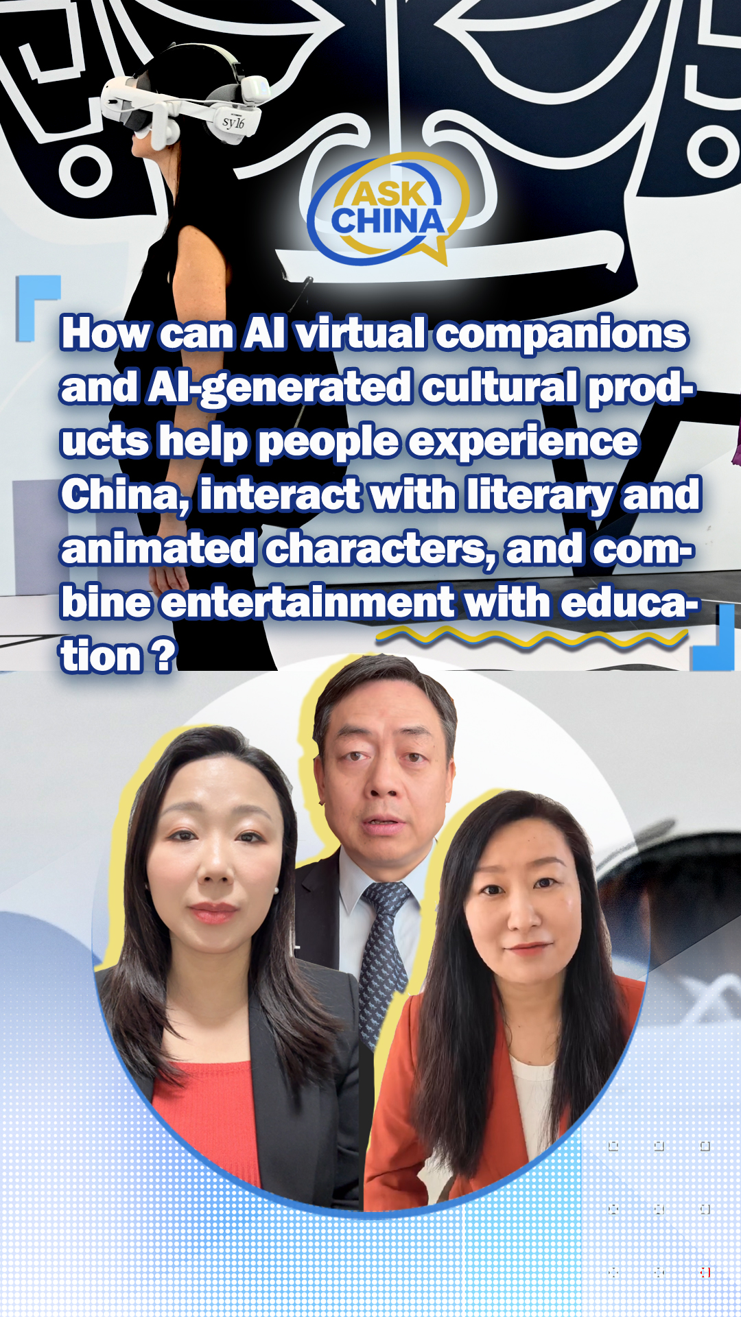 CGTN recently launched the "Ask China" campaign to satisfy international audiences' curiosity about China. We invite experts, professionals, editors, reporters and others to provide insightful answers to questions sent in by CGTN viewers around the world. Xu Li, CGTN French host, Wang Yiwei, professor at Renmin University of China, and Sarina, professor at Beihang University, explain how AI virtual companions and AI-generated cultural products can help people experience China, interact with literary and animated characters, and combine entertainment with education.