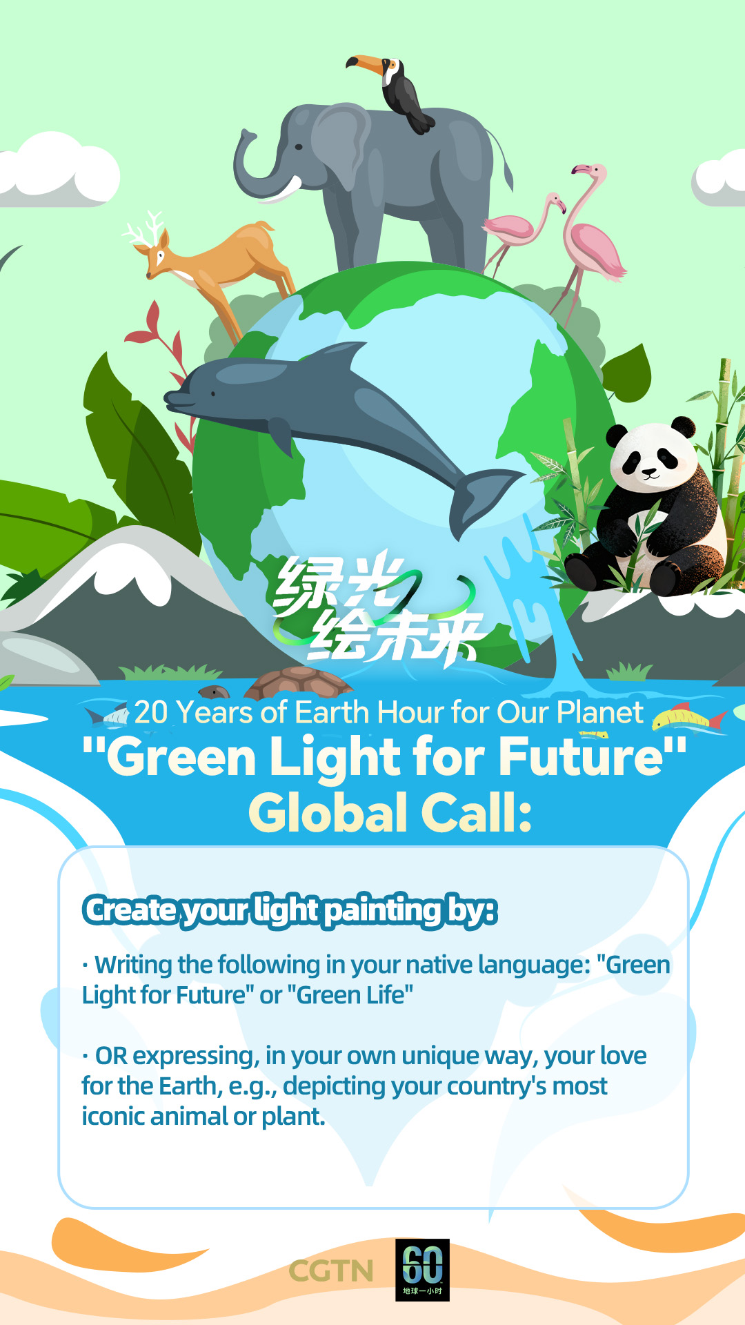 To mark this milestone moment with greater artistic resonance and communicative energy, CGTN and WWF are launching the "Green Light for Future" global open call, inviting light painting artists and photographers from around the world to lead their communities in switching off and creating art to express love and gratitude for our planet.