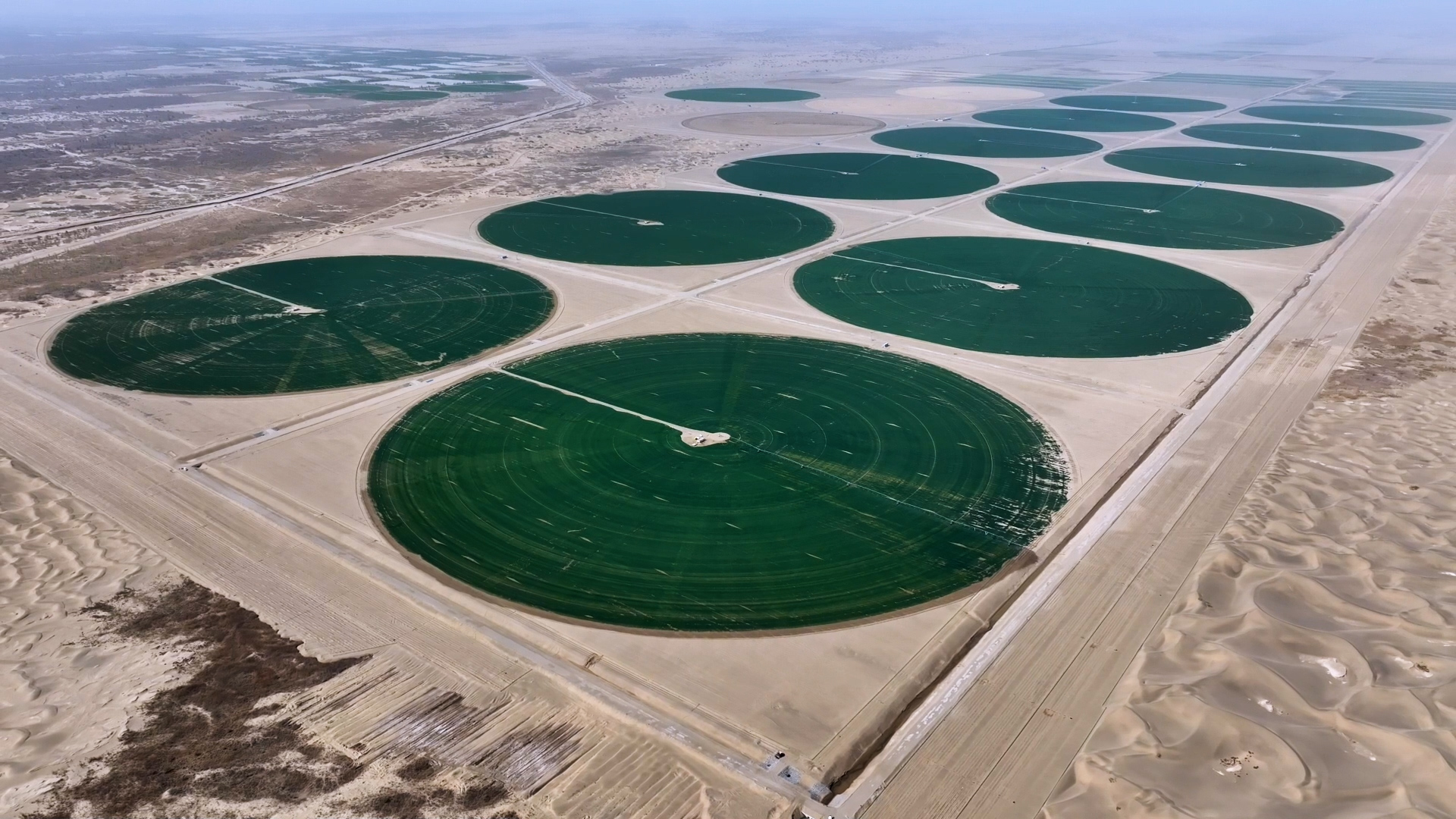 In Kunyu City, located on the southern edge of the Taklimakan Desert in the Xinjiang Uygur Autonomous Region, a remarkable transformation is turning barren desert into fertile farmland. To overcome the region's dry climate and sandy soil, high-efficiency sprinkler systems move across fields, spraying a precise mix of water and fertilizer to ensure crop growth while saving water. This year, Kunyu City has planted nearly 1,500 hectares of such circular farmland with wheat and sunflowers, achieving a positive cycle of desert control and agricultural prosperity, reaching dual goals of ecological restoration and economic development.
