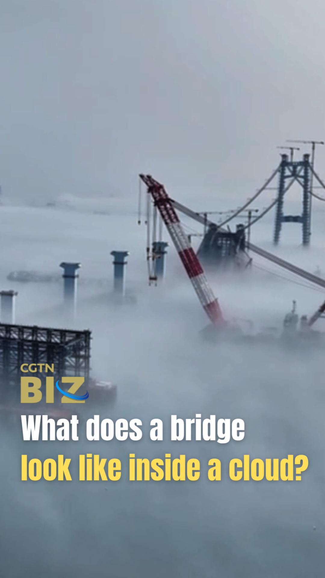 Sea fog turns the unfinished Xiamen-Jinmen Bridge into a floating silhouette in the clouds. Still under construction, the 19.6 kilometer cross-sea link is set to open in 2027.