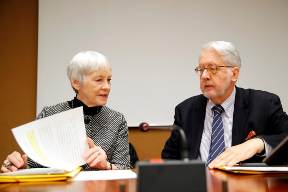 Paulo Pinheiro, Chairperson of the Commission of Inquiry on Syria (R), arrives with Karen AbuZayd, member of the Commission, before the launch of their report on sexual and gender-based violence in Syria at the United Nations office in Geneva, Switzerland, March 15, 2018. /Reuters Photo