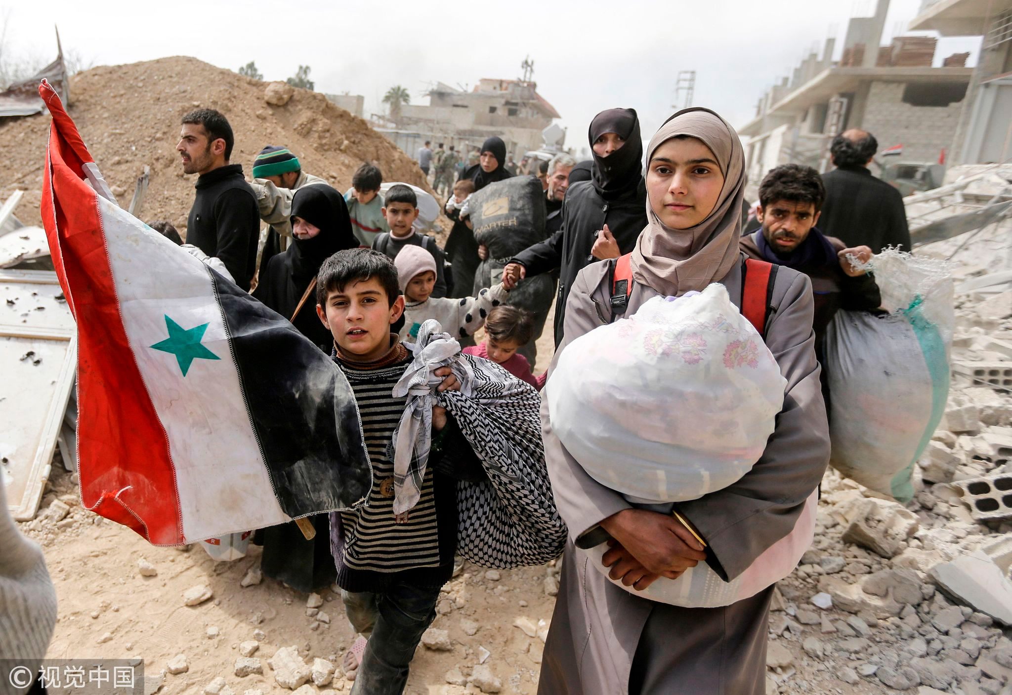 A Syrian child walks with a national flag with other civilians evacuated from the Eastern Ghouta enclave, as they pass with belongings through the government-controlled corridor opened by government forces in Hawsh al-Ashaari, east of the enclave town of Hamouria on the outskirts of the capital Damascus, March 15, 2018. /VCG Photo