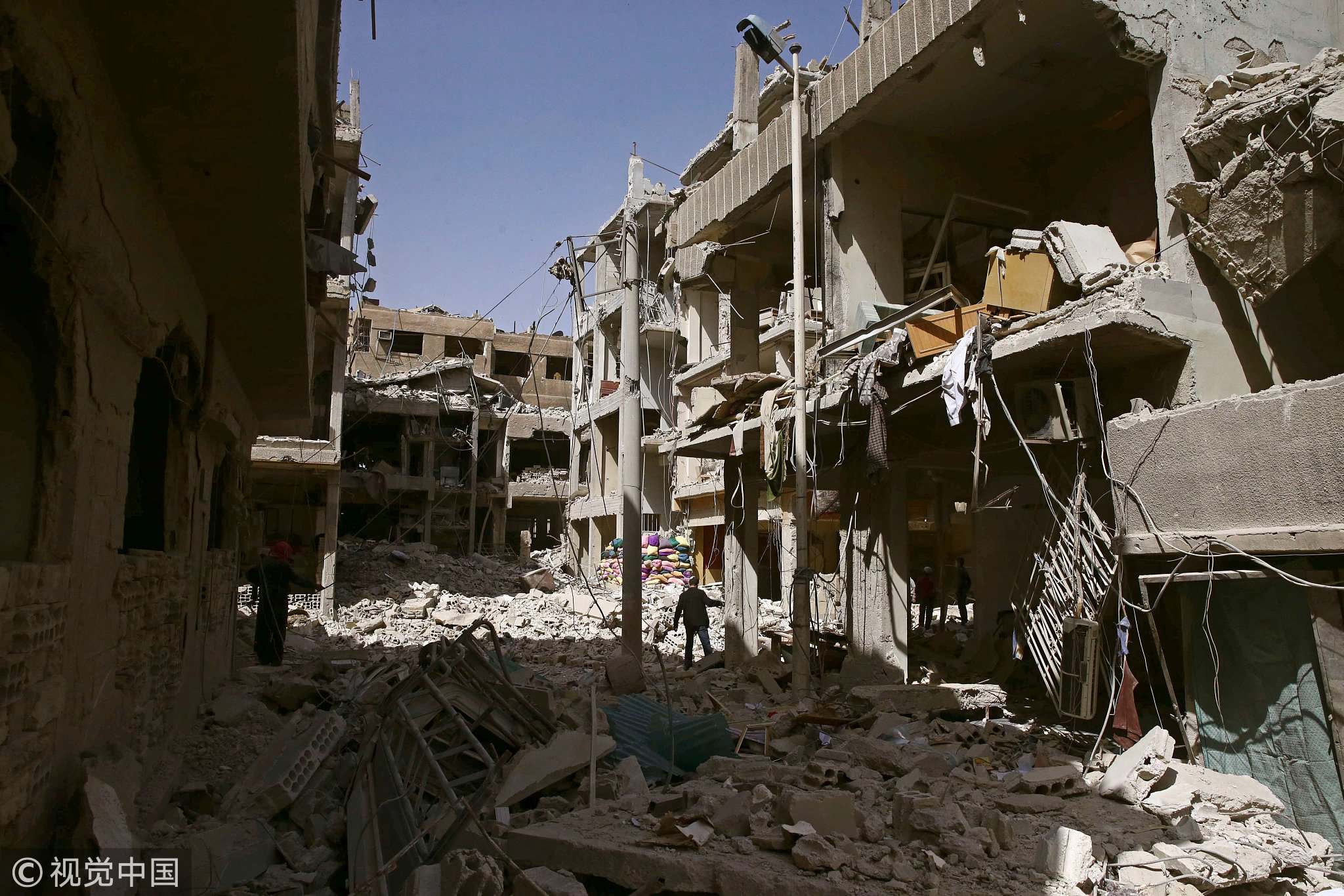 A man walks on rubble of damaged buildings in the besieged town of Douma, Eastern Ghouta, in Damascus, Syria, March 21, 2018. /VCG Photo