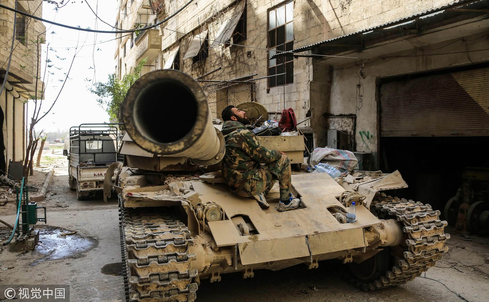 A Syrian government soldier sits on a tank stationed on the edges of the town of Zamalka in Eastern Ghouta on the outskirts of the Syrian capital Damascus, March 25, 2018, as government forces enter the town following a deal to evacuate civilians and fighters to a rebel-dominated part of northern Syria. /VCG Photo