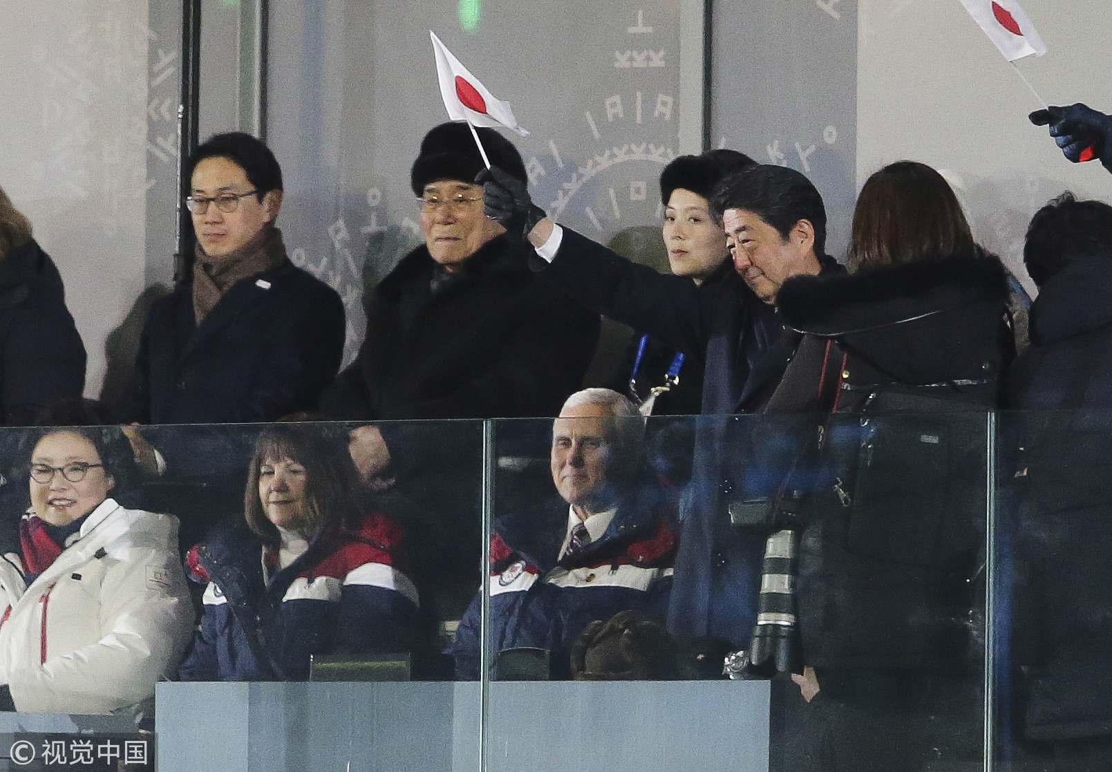 At the opening, Pence and Japan's Prime Minister Shinzo Abe sat next to President Moon Jae-in in the VIP seating section, while high-ranking DPRK delegates, Kim Jong Un's younger sister Kim Yo Jong and the ceremonial leader Kim Yong Nam, were sitting right behind them.