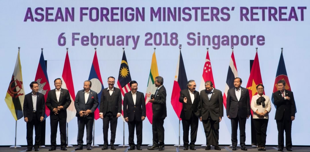 Group photo at the Association of Southeast Asian Nations (ASEAN) Foreign Ministers' Meeting retreat in Singapore, February 6, 2018. /Reuters Photo