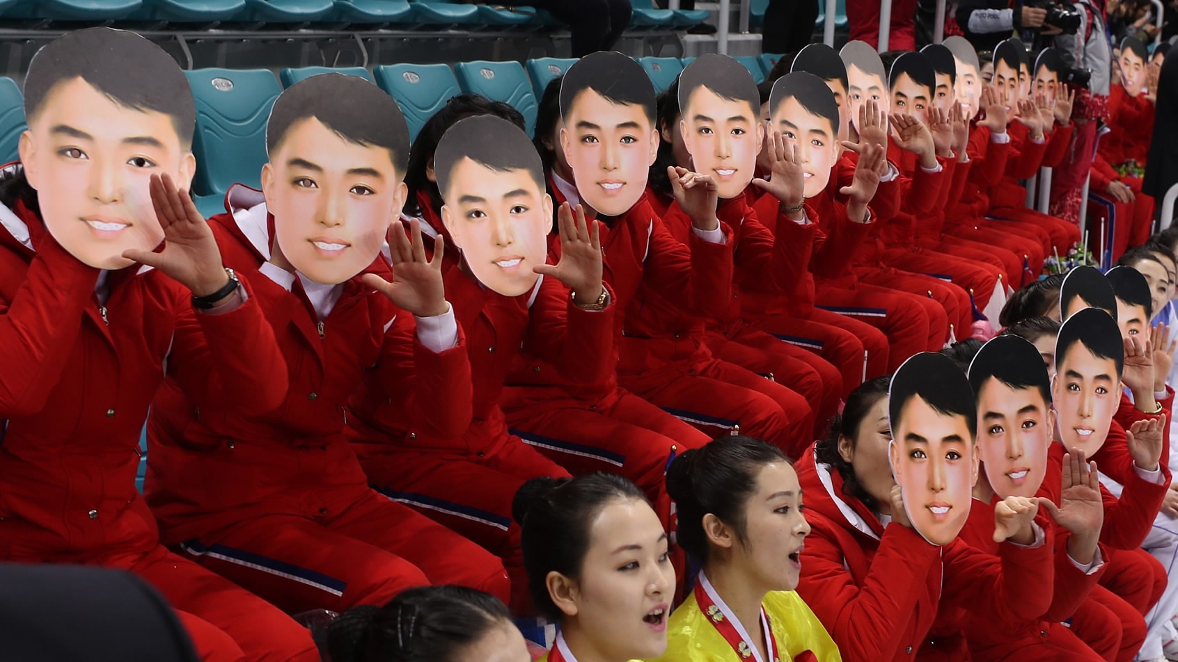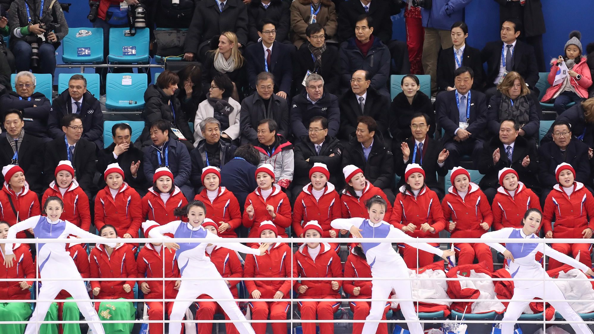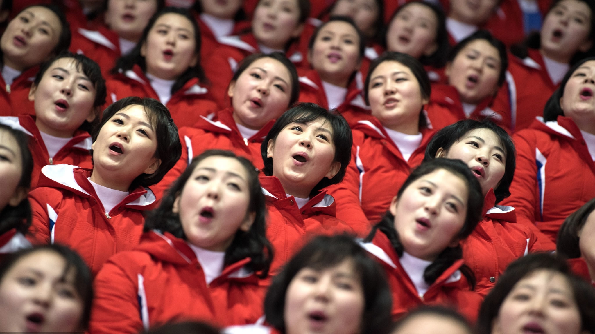 At Saturday’s women's ice hockey match between Switzerland and the joint Korean team, DPRK cheerleaders split up into groups and situated themselves in various sections around the ice rink. The 200-plus team command spotlight at PyeongChang Winter Olympics with synchronized chants. /VCG Photo