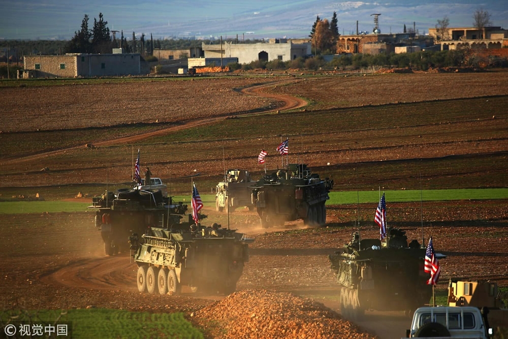 March 5, 2017: A convoy of US forces armored vehicles drive near the village of Yalanli, on the western outskirts of the northern Syrian city of Manbij. /VCG Photo
