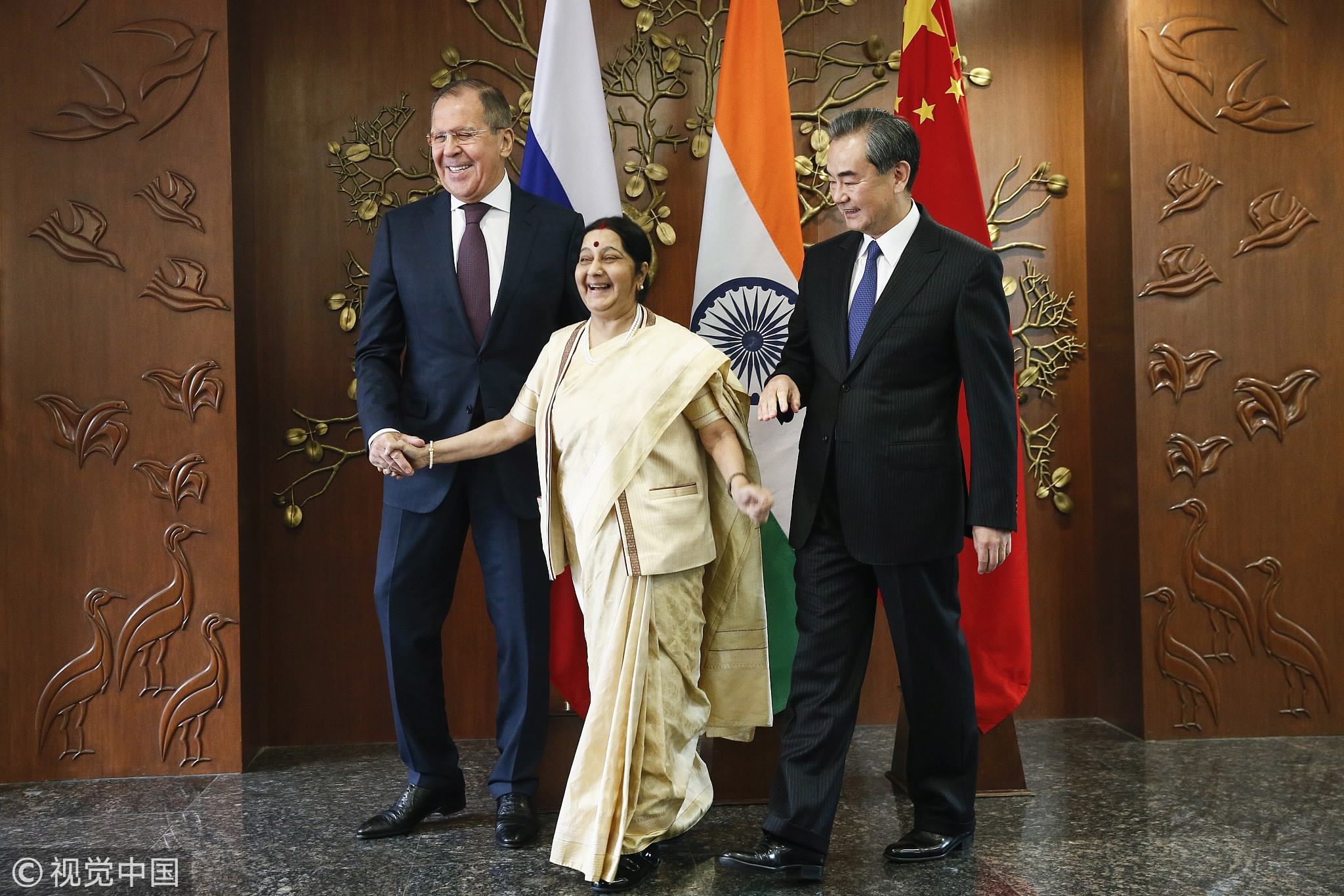 From left: Russia's Foreign Minister Sergey Lavrov, India's Foreign Minister Sushma Swaraj, and China's Foreign Minister Wang Yi joining hands ahead of the 15th Russia-India-China (RIC) meeting of foreign ministers in New Delhi, India, on December 11, 2017. /VCG Photo