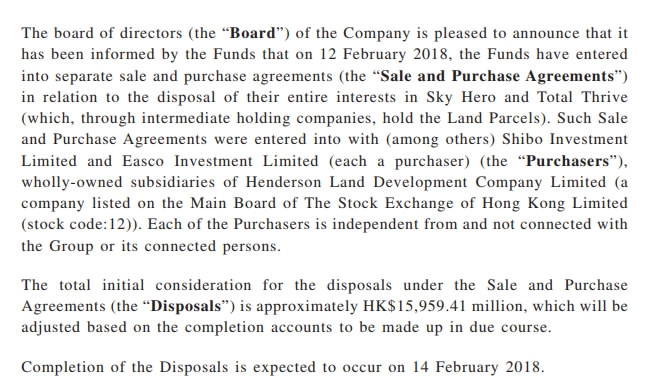 Completion of the deal for the two pieces of land at Hong Kong’s Kai Tak area was expected to be completed on Feb. 14, HKICIM Group said.