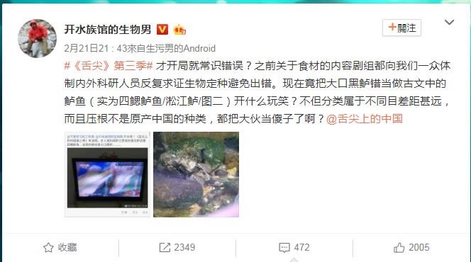 Picky viewers complain that some of the narration is not accurate, while others pinpoint misleading content. For instance, marine life expert Zhou Zhuocheng wrote on his Weibo social media account that US-imported largemouth bass is used to describe fish that appeared in Chinese literature more than 1,700 years ago in east China’s Taihu Lake.