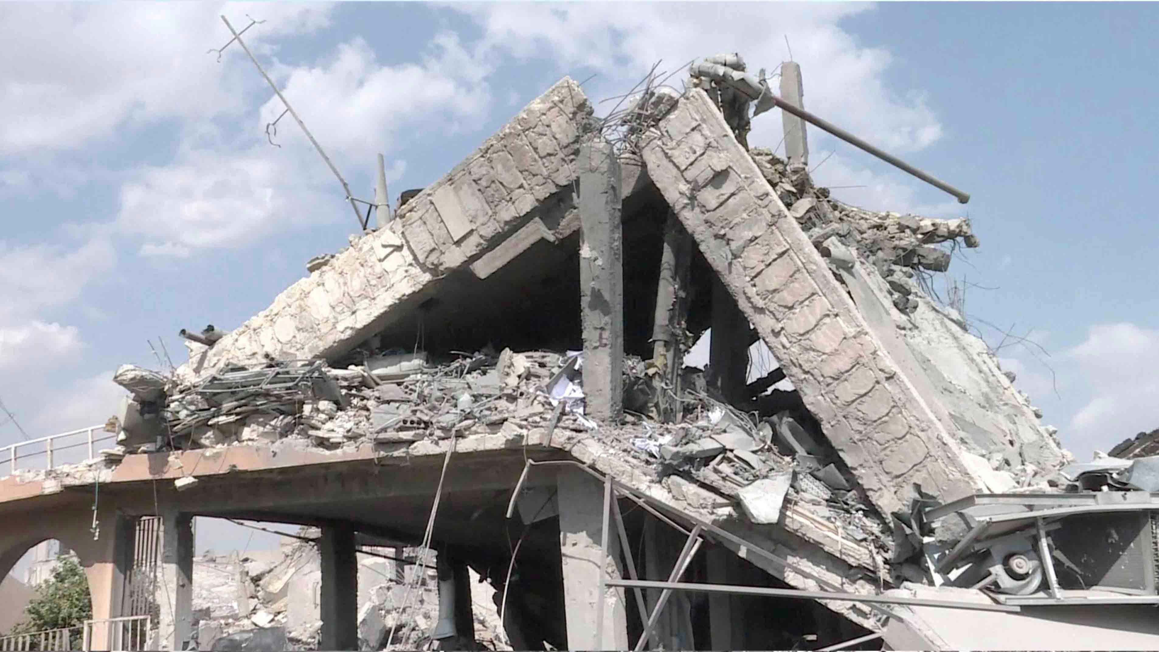 Syrian state television shows images of a destroyed research center in Barzeh, north of Damascus. Meanwhile, satellite images released by DigitalGlobe show the aftermath of air strikes by US and coalition operations on three facilities.