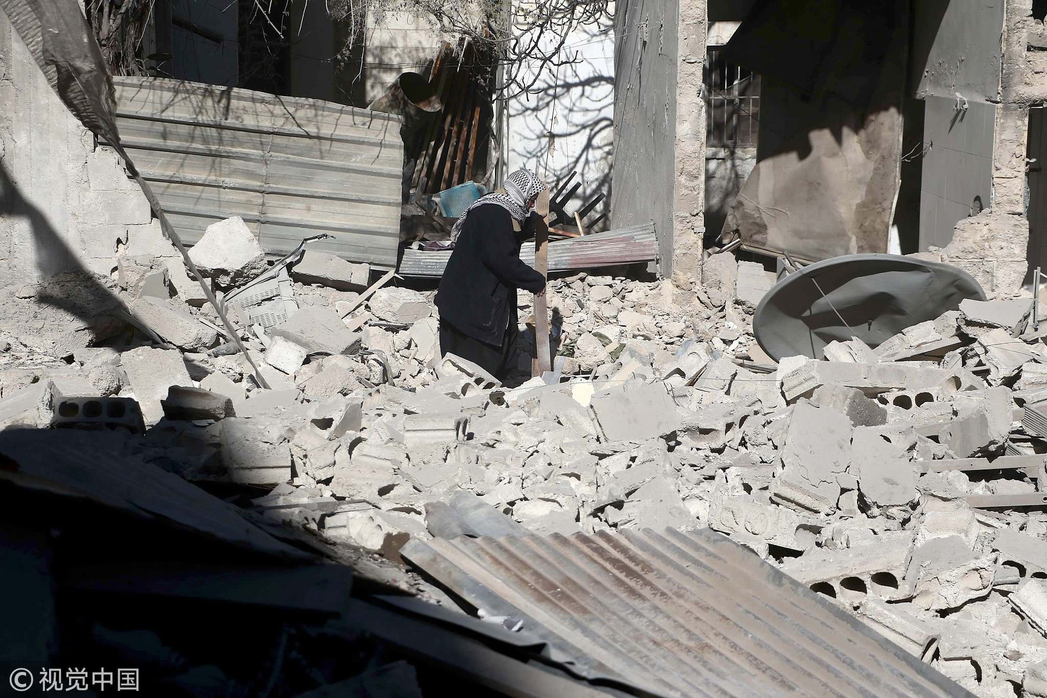 A Syrian inspects debris of a destroyed building after an airstrike on Arbin town of Eastern Ghouta, Damascus, Syria, on February 27, 2018. /VCG Photo