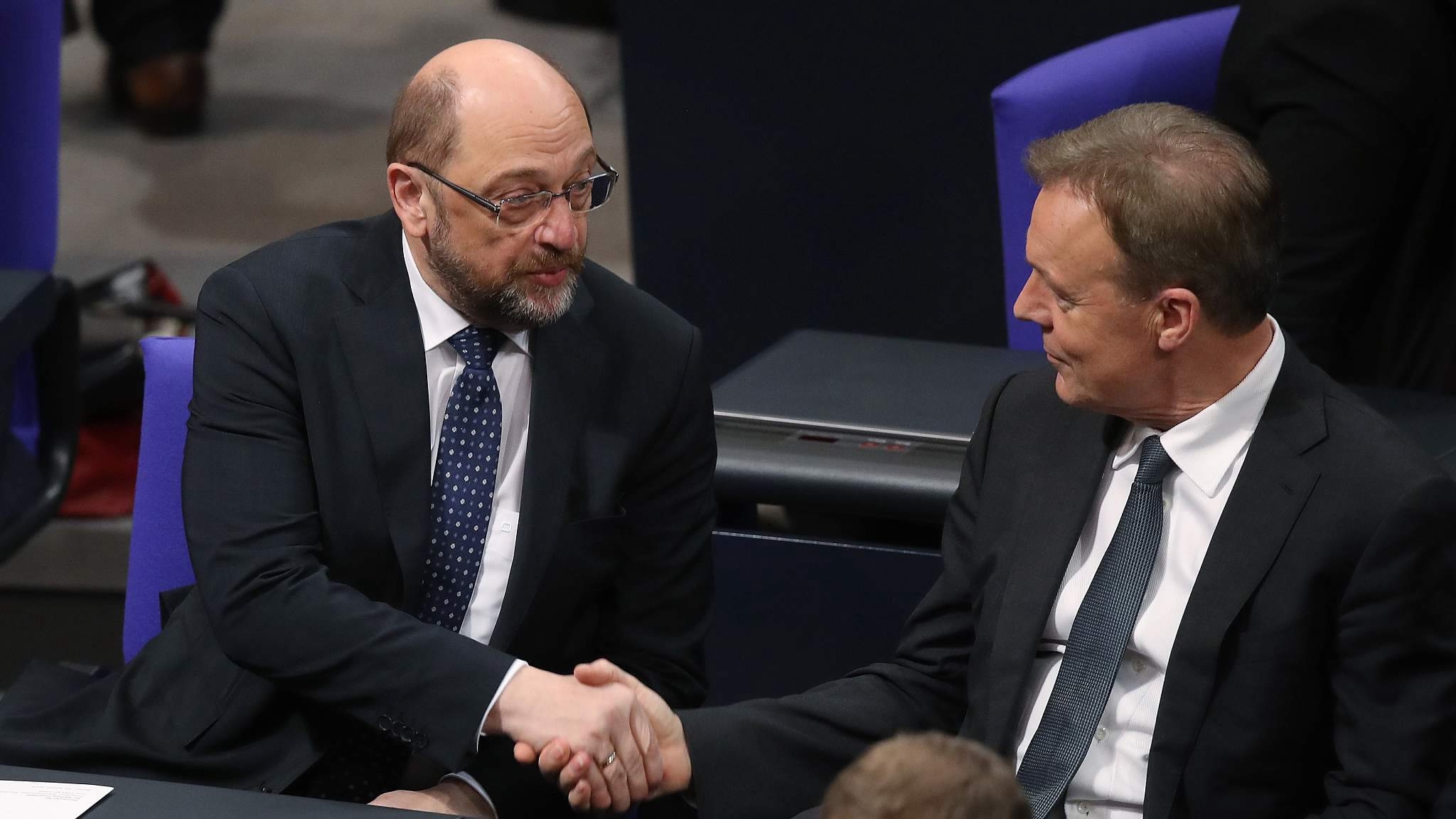 Martin Schulz (L), head of the German Social Democrats (SPD), greets party colleague Thomas Oppermann as they attend a memorial ceremony for late former Bundestag President Philipp Jenninger in the Bundestag in Berlin, Jan. 18, 2018. /VCG Photo