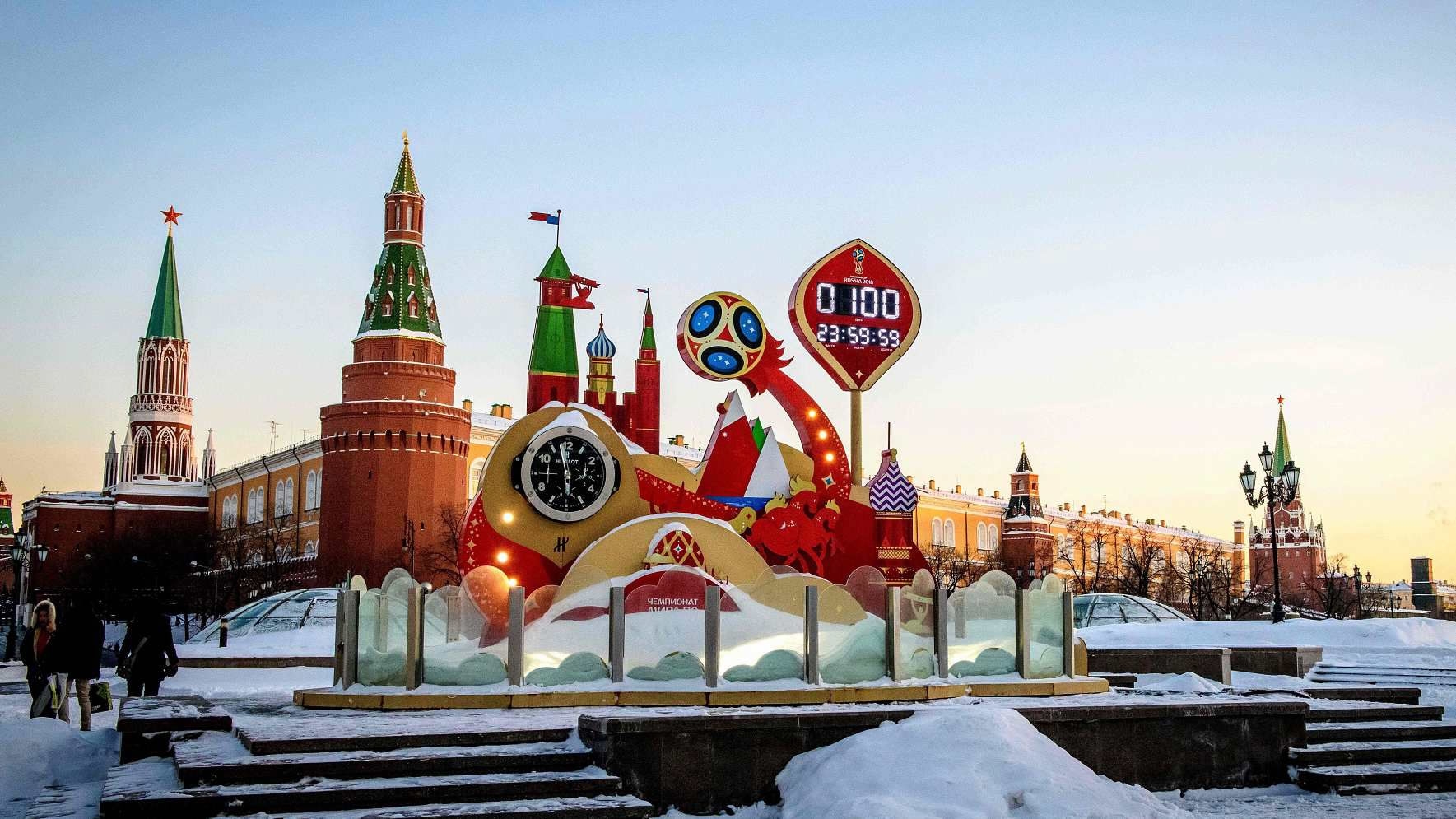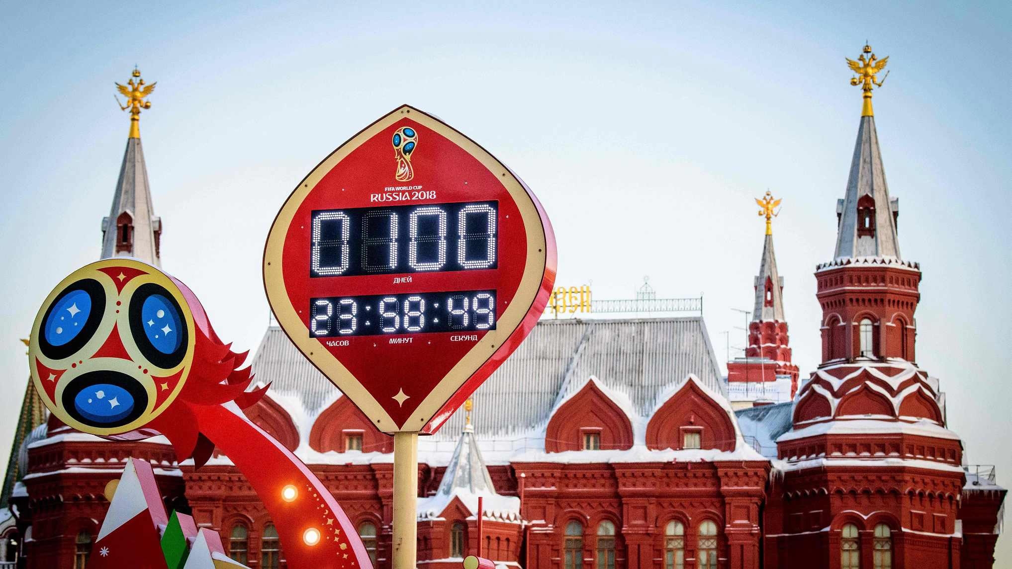File photo taken on the evening of March 5, 2018 showing the digital FIFA World Cup 2018 countdown clock placed in front of the Red Square and the Kremlin in Moscow. /VCG Photo