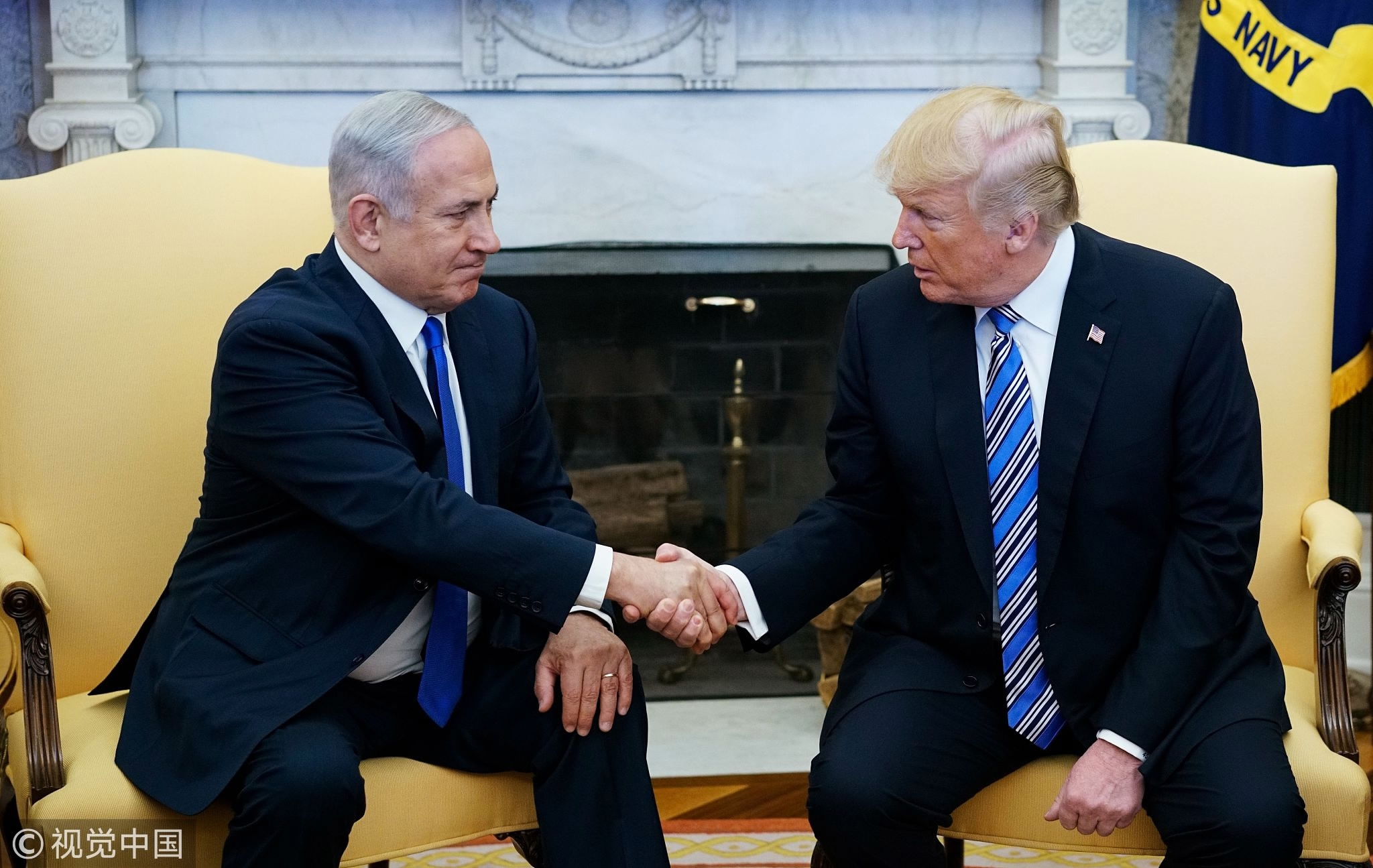 US President Donald Trump shakes hands with Israel's Prime Minister Benjamin Netanyahu in the Oval Office of the White House, March 5, 2018. /VCG Photo