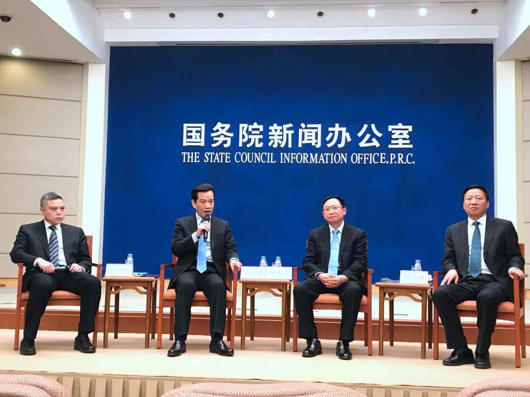 (From left to right) Moderator Hu Kaihong, Deqing Party Chief Xiang Lemin, Meitan Party Chief Wei Zaiping and Yongning Party Chief Qian Kexiao hold a press conference at the State Council Information Office on Tuesday. /CGTN Photo