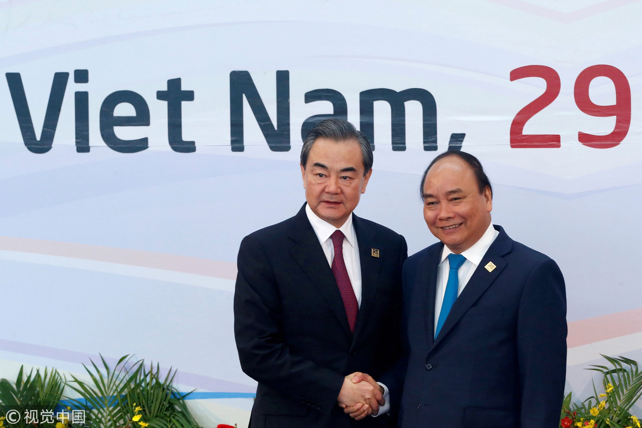 Vietnam's Prime Minister Nguyen Xuan Phuc (R) greets Chinese State Councilor and Foreign Minister Wang Yi upon his arrival at the National Convention Center for the Greater Mekong Subregion Summit in Hanoi, Vietnam, March 31, 2018. /VCG Photo