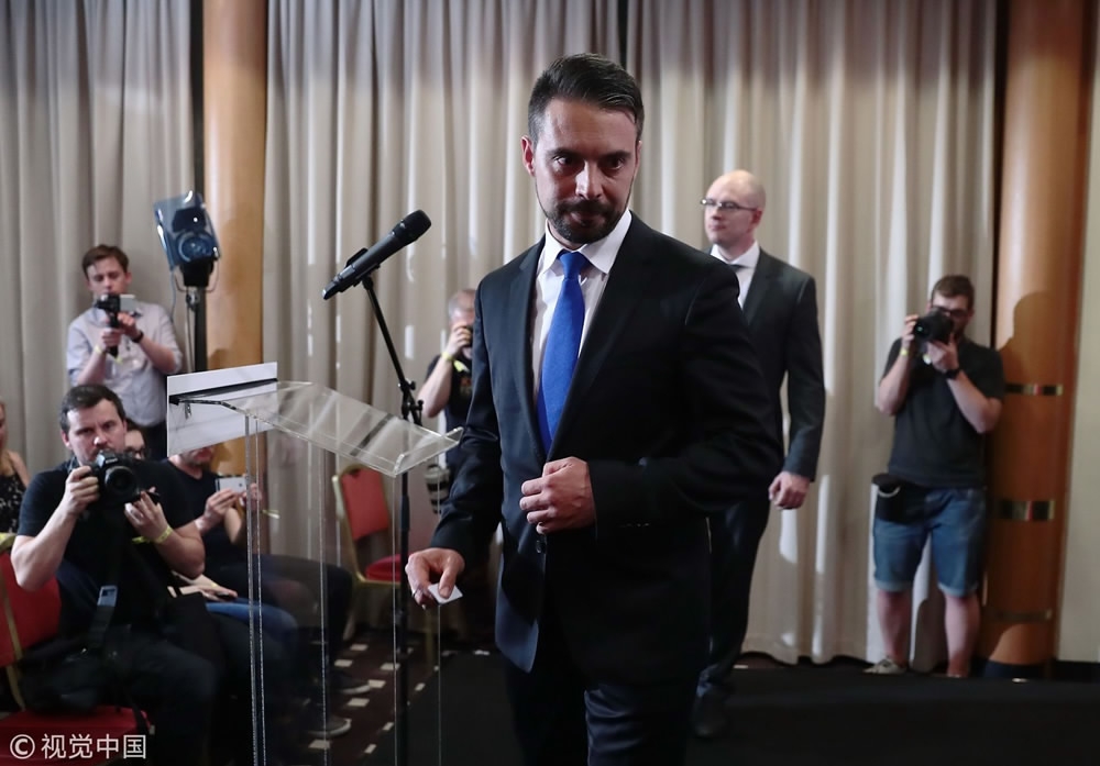 Gabor Vona, leader of Hungary's Jobbik party, reacts during a press conference after the results of the parliamentary elections in Budapest, Hungary, April 8, 2018. /VCG Photo
