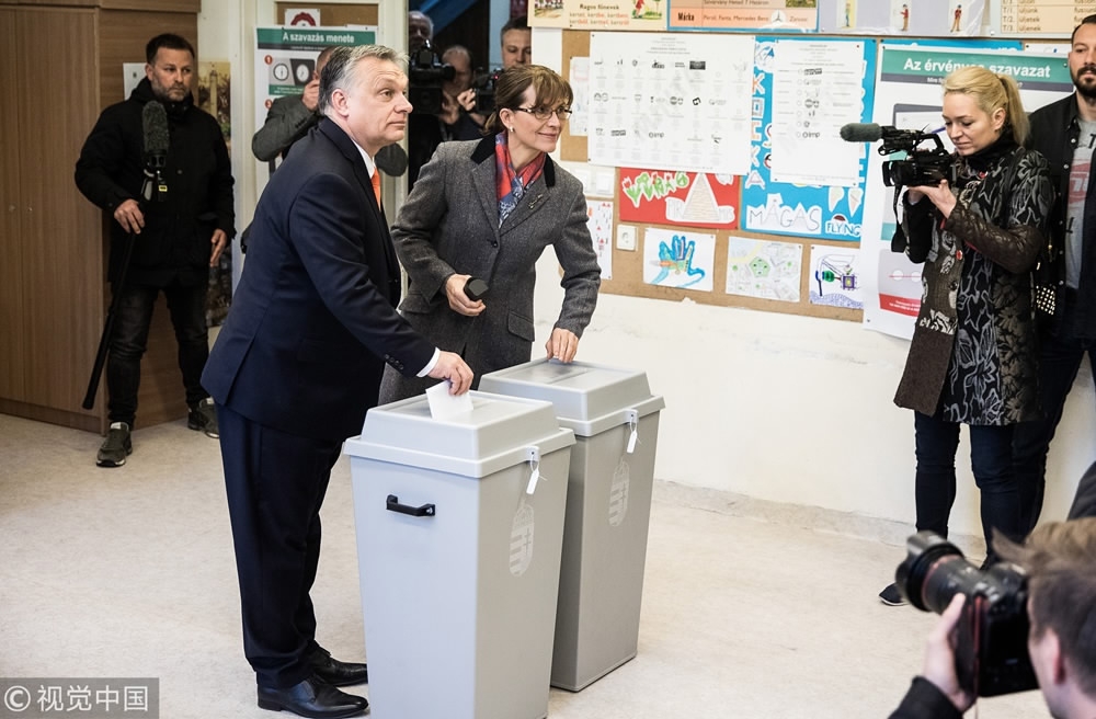 Viktor Orban (L, Front), Hungary's prime minister, casts his vote with his wife, Aniko Levai, at a polling station during parliamentary elections in Budapest, Hungary, April 8, 2018. /VCG Photo