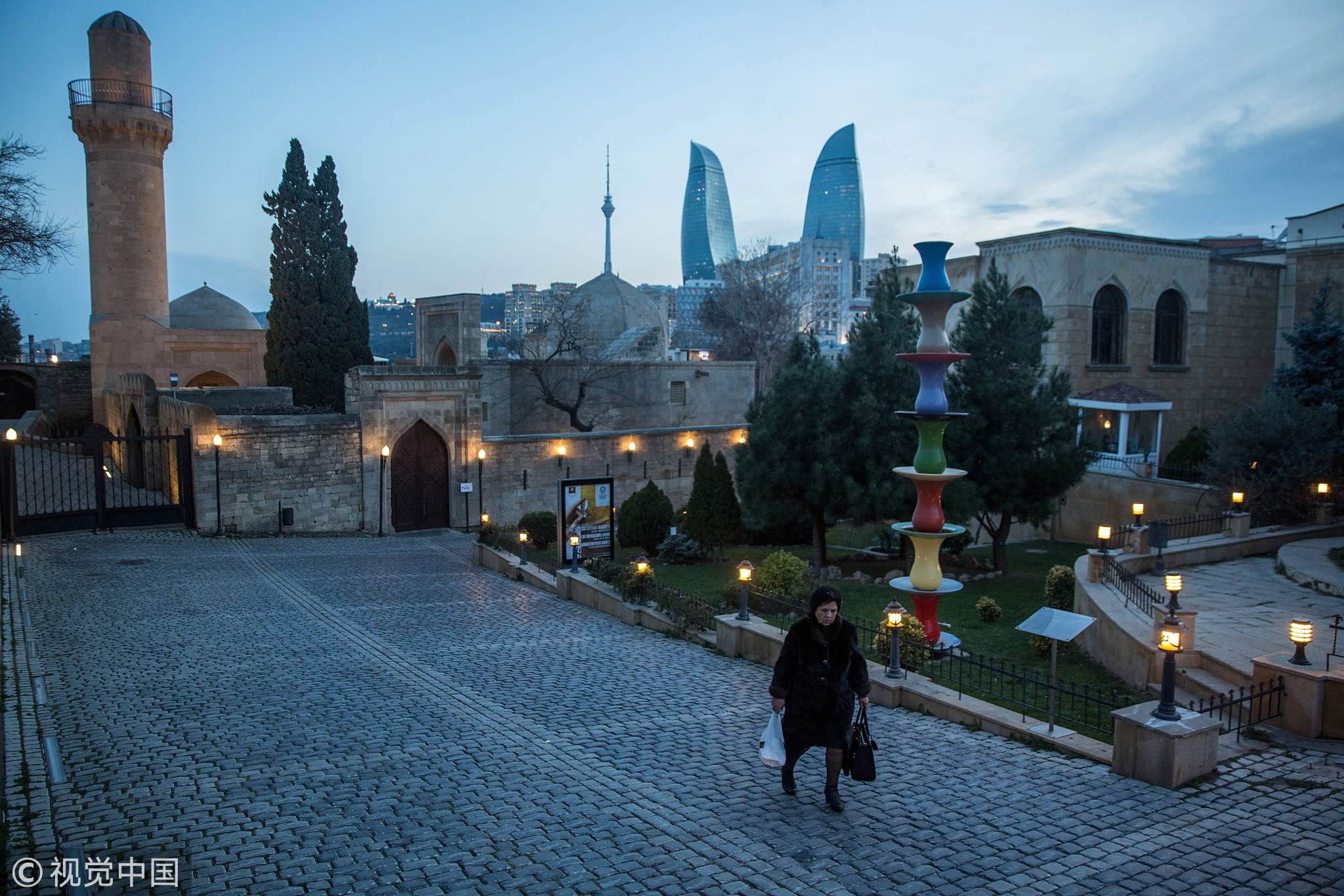 The Old City of Baku, Azerbaijan, with modern Flame Towers stand in the background, March 16, 2018. /VCG Photo