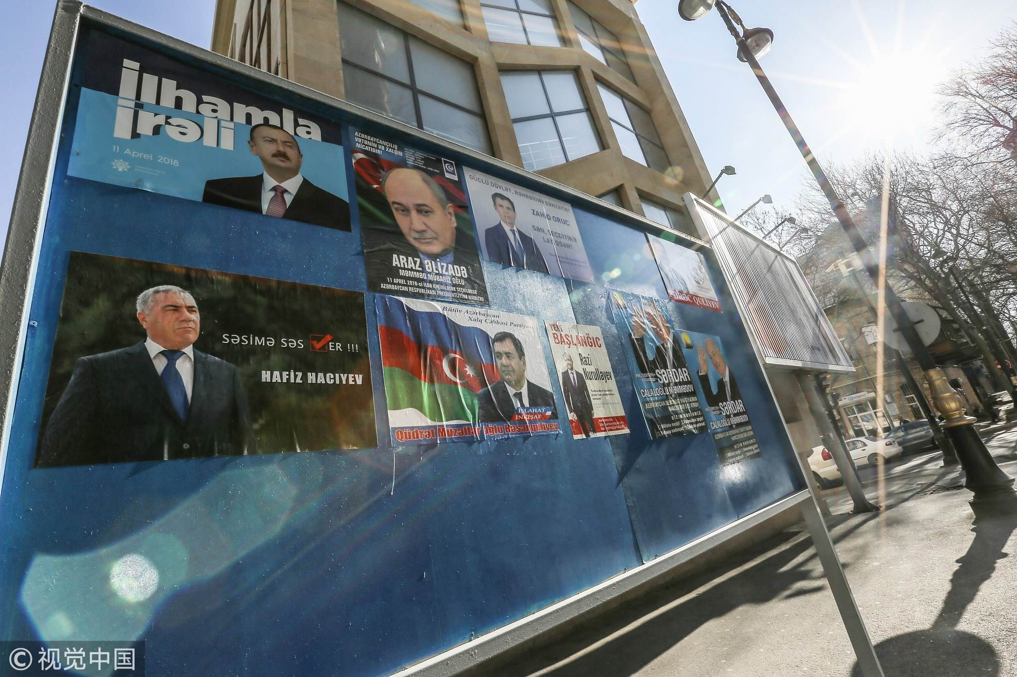 Candidates' posters are seen on a billboard ahead of presidential elections in Baku, Azerbaijan, April 10, 2018. /VCG Photo