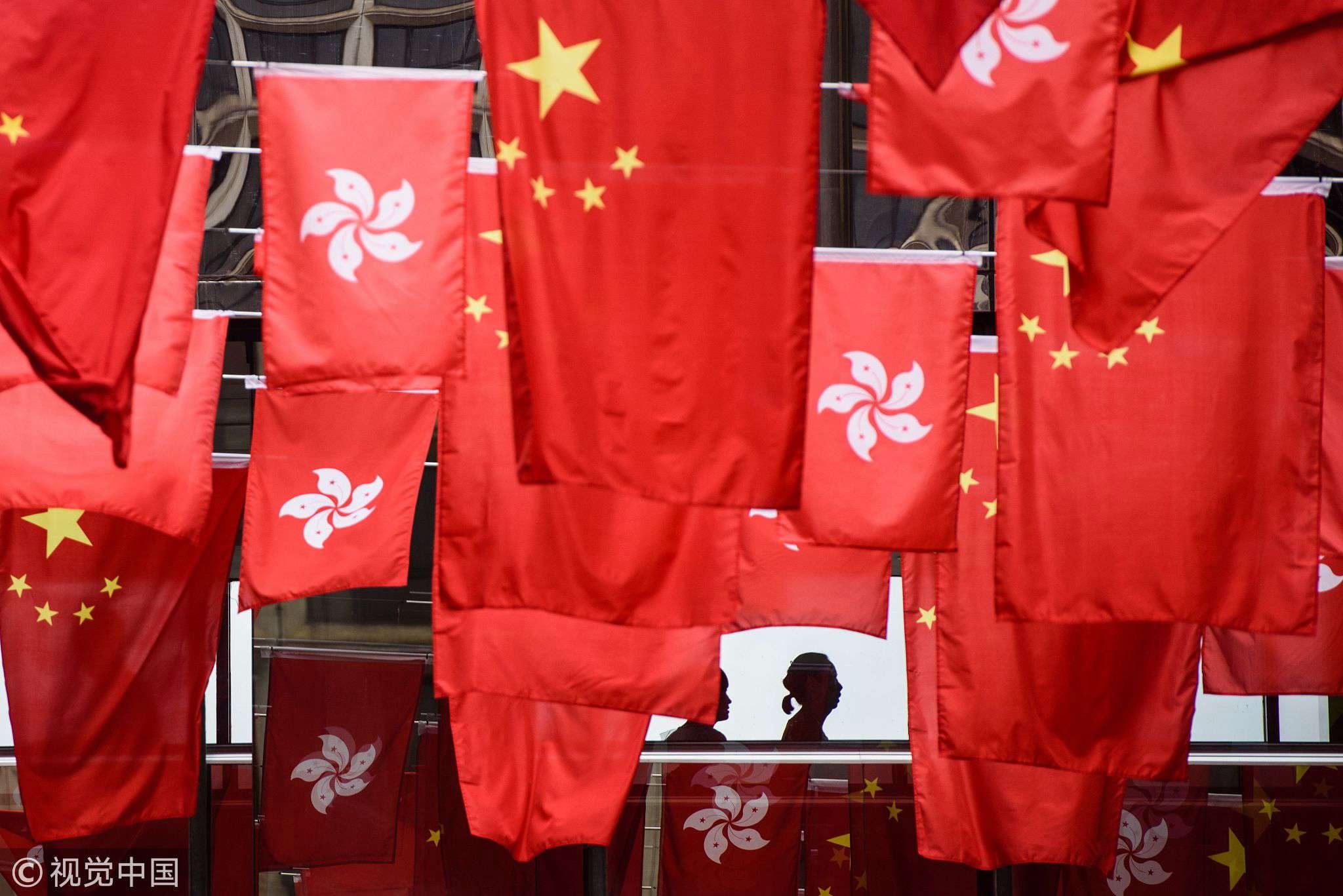 File of the Chinese national flags and Hong Kong SAR flags hanging above streets to mark the 20th anniversary of Hong Kong's return to China. /VCG Photo