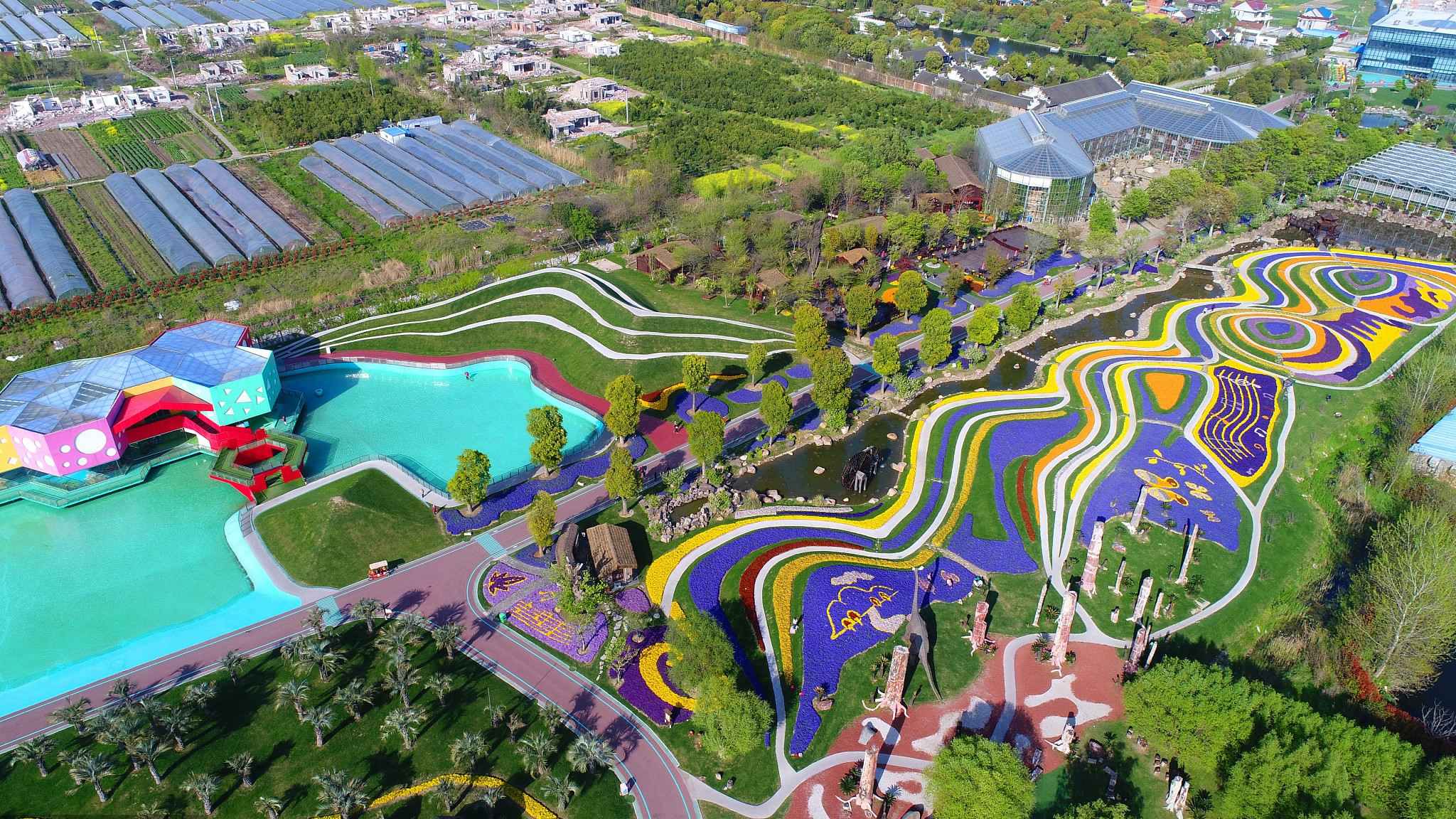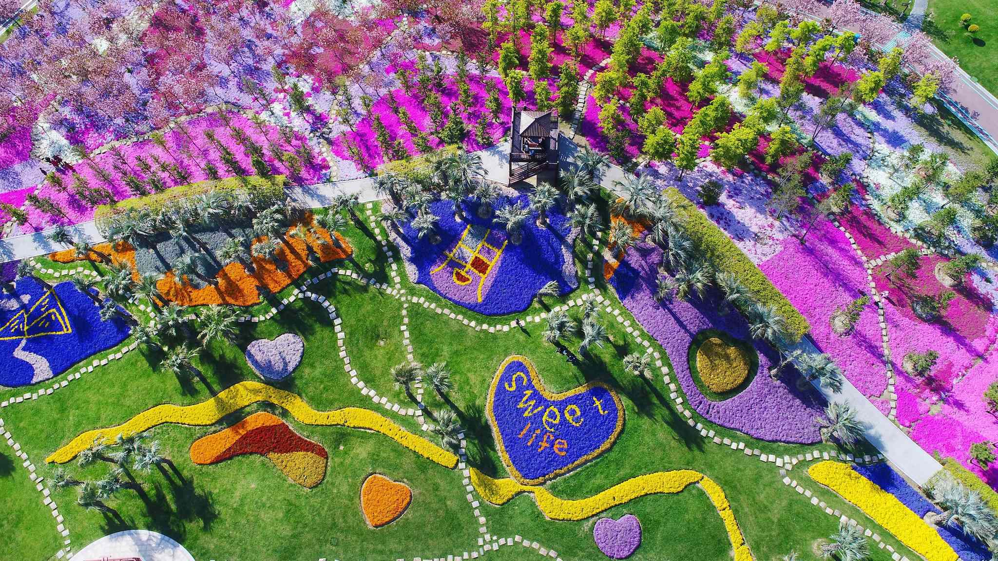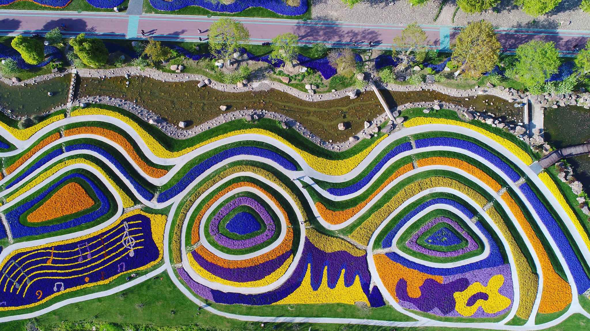 Flowers can be seen in full bloom in Nantong Zhou Ji Green Expo Park in east China’s Jiangsu Province. It has also been described as a natural artist’s pallet from a bird’s-eye view. /VCG Photo