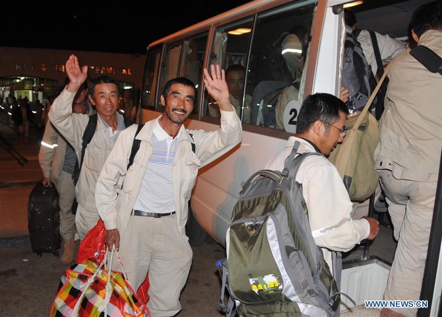Egyptian and Romanian technicians working for Chinese companies in Yemen prepare to board a Chinese navy vessel in Aden Harbor, Yemen, March 29, 2015. /Xinhua Photo