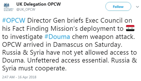 A day earlier, the UK's OPCW delegation tweeted: "Russia & Syria have not yet allowed access to Douma," adding that "unfettered access essential. Russia & Syria must cooperate."
